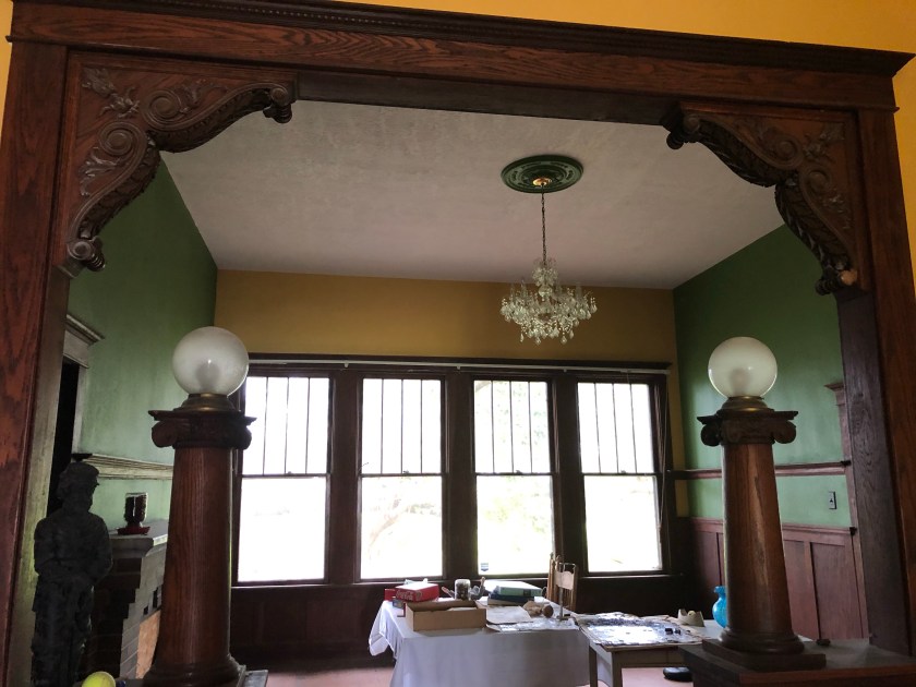 Then we talked to the lovely woman across the street, who grew up playing in the house and knew the owners very well. We learned that the last owners loved to buy old things and fix them up, which is fully evident in the workroom chock full of old chandelier parts, stained glass, and old ceramic heaters. When the wife died, the widower stopped working on the house, but he still covered the house in Christmas lights every year. He’d bought 10,000 more lights the year he died.