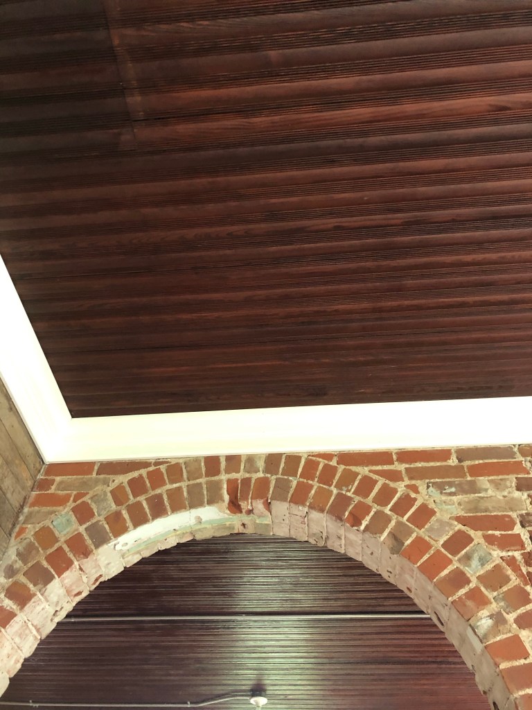 Ceilings. I learned in RYHH that beadboard wood ceilings are not all that common, but maybe they were more common in this part of the country than in other places, because some of the other old houses I’ve looked at around Cameron also have the ceiling types we have here. We did not replace any ceilings in the offices. We left the stained ones stained and will be repainting the white ones the Dreamscape light blue color we have elsewhere.