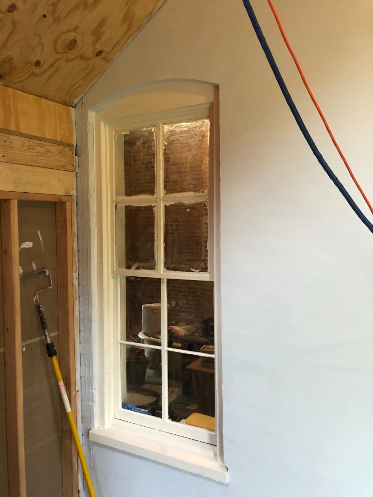 Another original exterior window we will keep (it hasn’t been painted yet). Chris had to put new siding under the windows, but spaced it out a bit to blend in with the original boards above it. Under that is original brick. We painted it all the same color to minimize the madness.