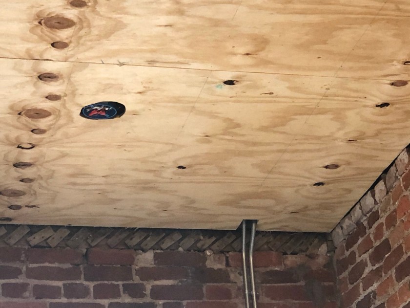 We had to replace the ceiling in the entry hall, because it had been badly broken up by the nonstandard stairs that had been built there. Right now it’s just nice, smooth plywood with openings for the lighting, but that will be replaced by a tin ceiling, which is actually historically appropriate (hooray) though we are not going to paint it. I guess it won’t be too much longer before we order that. It goes in the bathrooms as well.