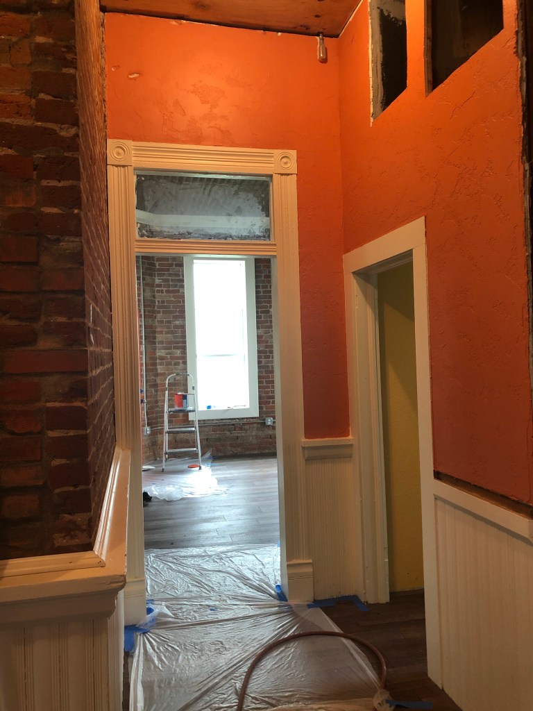 Walls. Did you know that in old houses, they never exposed the brick on walls? Only today did Chris learn that the plaster he’d removed was all original to the house. Well, the plaster is gone now, so we can’t do the careful restoration techniques Hanson shares. We are okay with this, since our goal is a functional, modern office building. This makes the exposed electrical wiring a “feature” not an eyesore (at least to us) and the brick a beautiful backdrop for the rustic furnishings that Kathleen prefers.