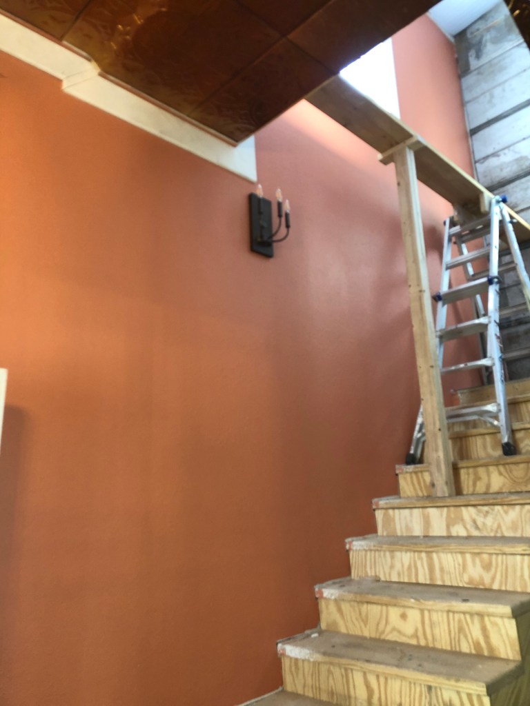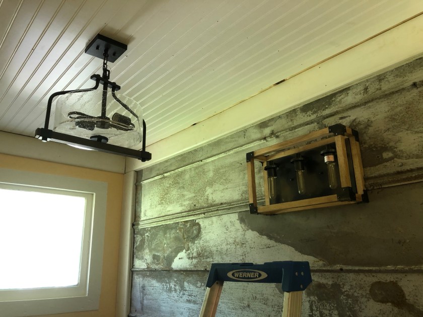 A couple of the fixtures didn’t work out so well. We broke one of the shades in the main bathroom, but Chris is gonna get a new one. And we definitely had the WRONG Edison bulbs, so they will get returned. And, while we had carefully arranged the recycled white fixtures in the stairwell to where they lined up evenly, though they hang from a sloped ceiling, they were put in backwards at first. They got fixed, and the upstairs sconce got raised up.