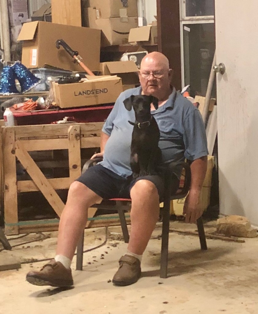 I got worried he had wandered over to the Laywells across the street, which he had done once or twice before, so Kathleen and I jumped into Hilda, our utility vehicle, and went searching. We saw the Dorners. Hi Dorners. We turned around. We ran into Mr. Laywell on his utility vehicle (they go up and down the road all the time), who did indeed have a small black dog in his lap!