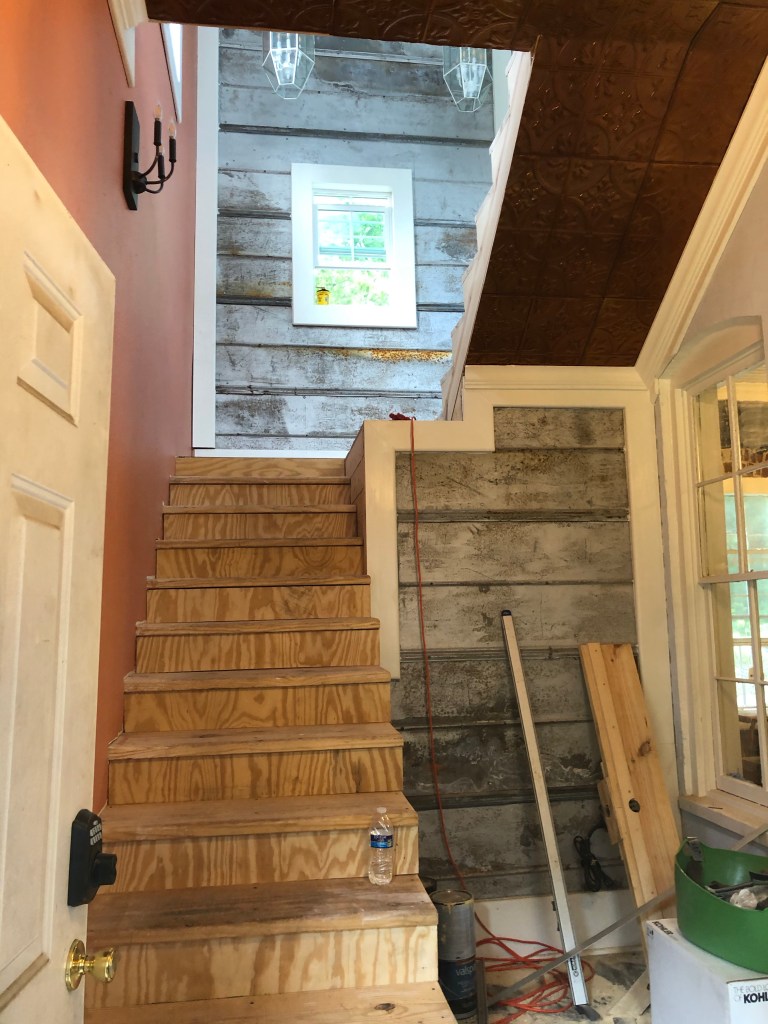 The rest of today, Chris has been covering nail holes, sanding, and otherwise preparing the stairs for being stained. That will be another huge milestone.