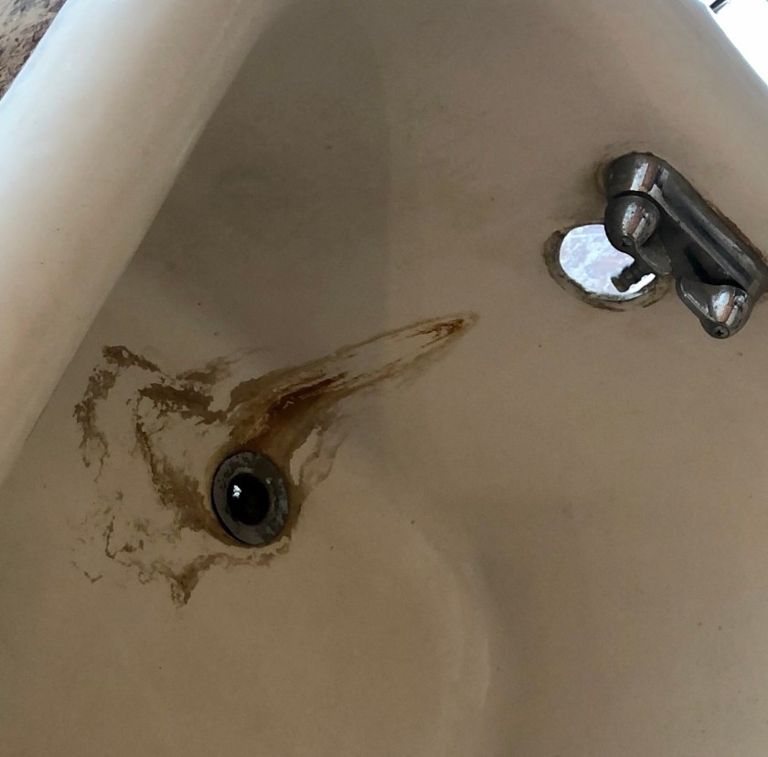 But yes, I did get CLR, which is a product to remove lime stains, rust, and such, this morning. I ran out between phone calls to see if it would work. I was not as happy with it as I hoped to be. It’s definitely not a miracle product, and appears that it will need to be used repeatedly with the scrubber. I can’t use a metal scraper, because I don’t want to damage the tub. Sigh. It’s getting there.