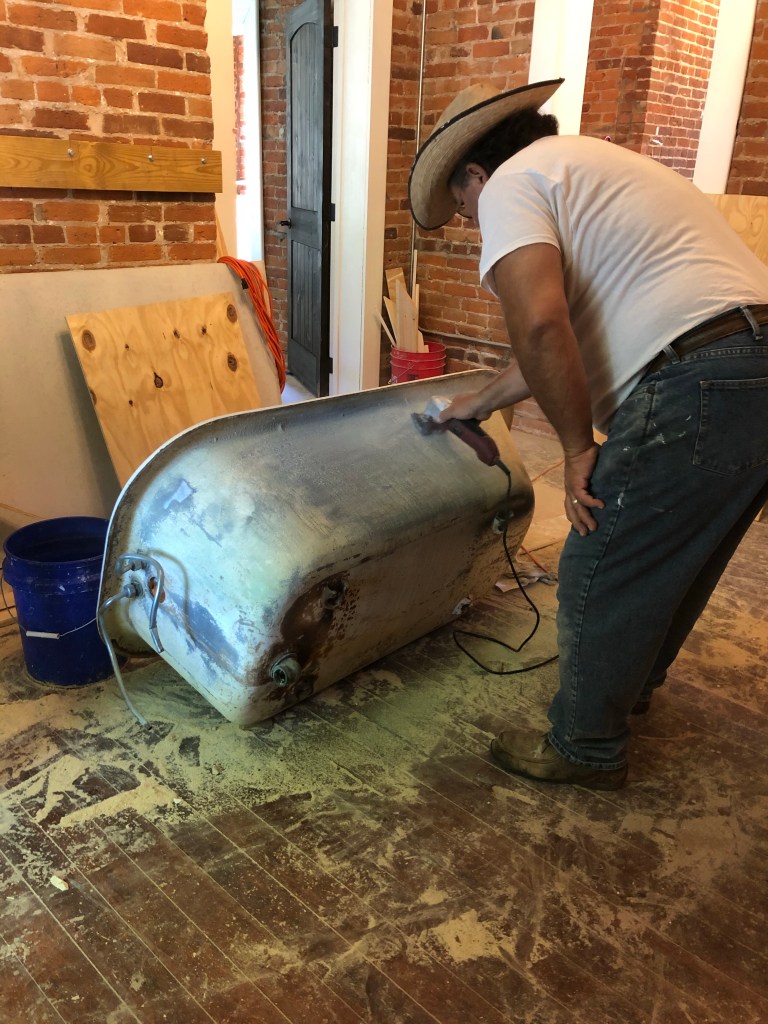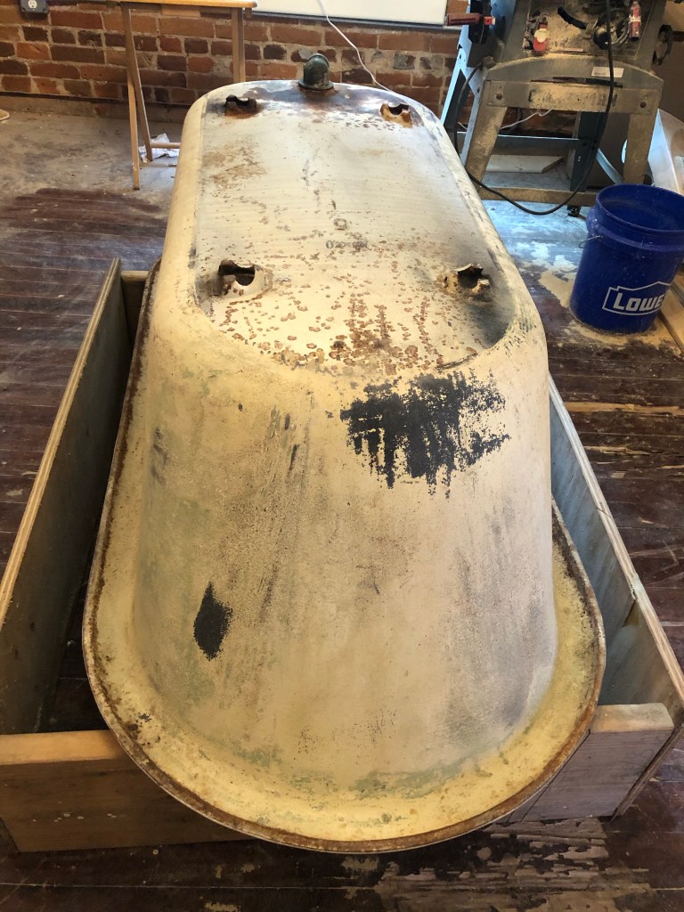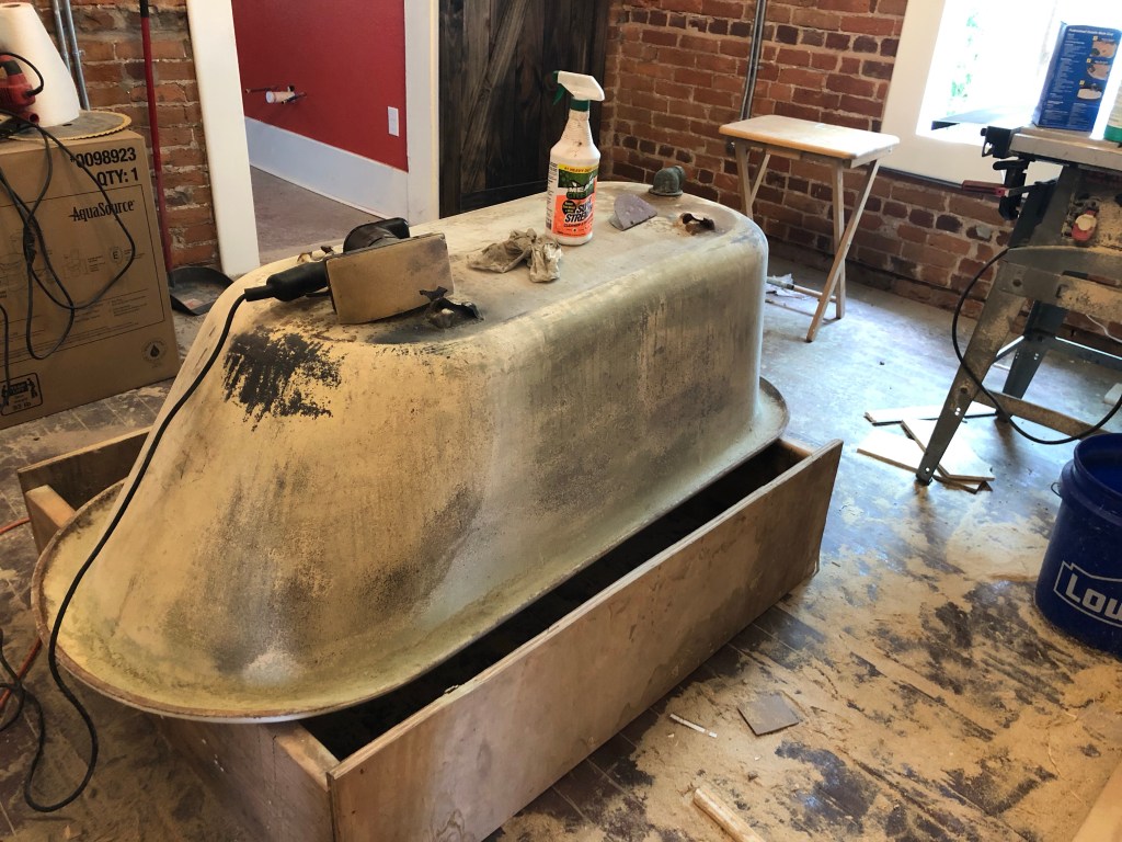 Back to sanding I went. Between me and Chris, and three sanding methods, it’s as good as it’s going to get. I got the tub exterior all clean, so it’s ready to paint.