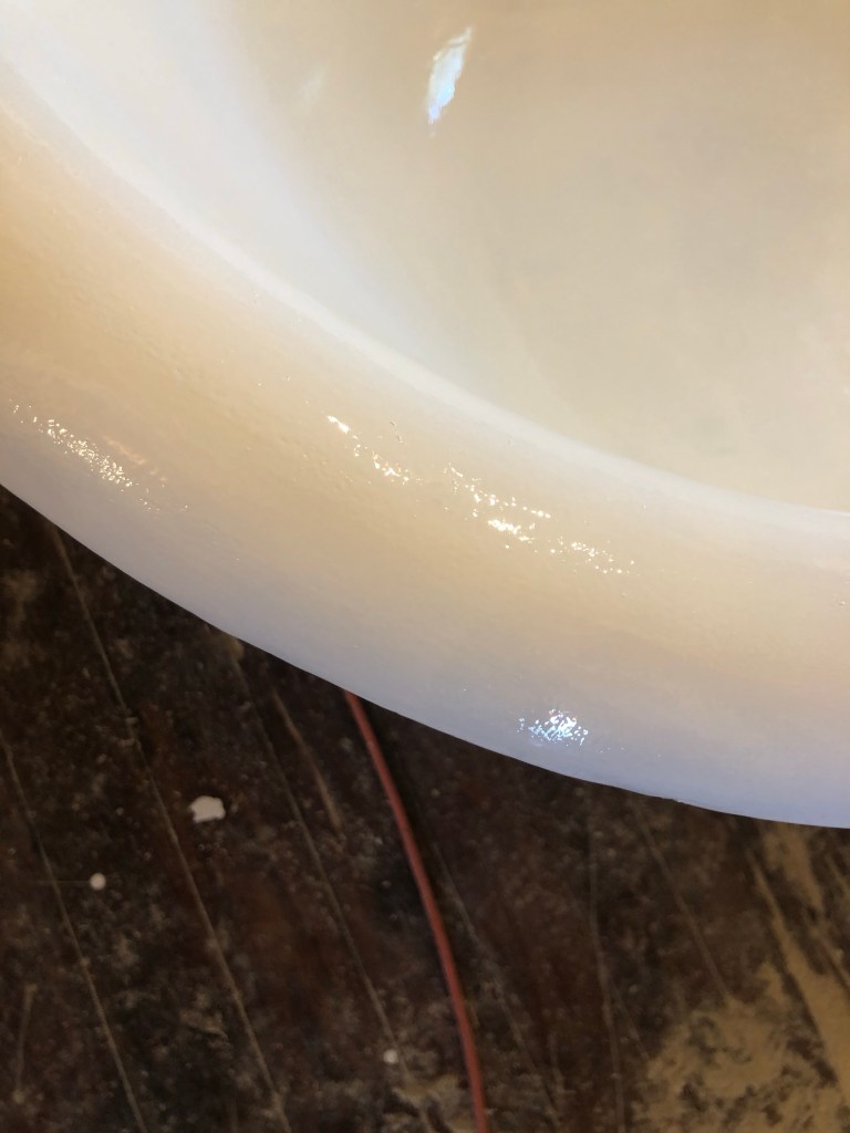 Tubby has been getting all white and shiny. Chris has now applied two coats of porcelain paint, and plans to do one more, because he’s not real happy with the bits of texture that show up from using a roller on the second coat. I’m just happy to see Tubby standing up on those new black feet.