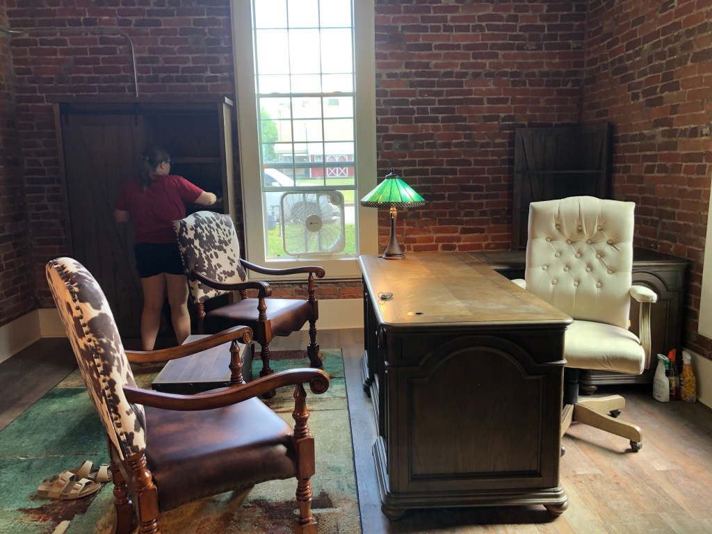 She spent a lot of sweat equity (especially so, considering that the air conditioning isn’t hooked up yet) putting together her beautiful office furniture selections over the past few days. Wow, she picked some wonderful things, and the color scheme is so restful and rustic!