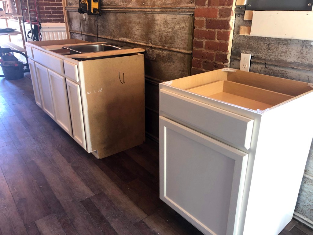 Anyhow, the cabinets are all painted and put together, so this morning Chris and I debated exactly where they are going to go. There’s a low electrical outlet that we have to take into consideration, and we need to leave the right amount of space for the refrigerator.