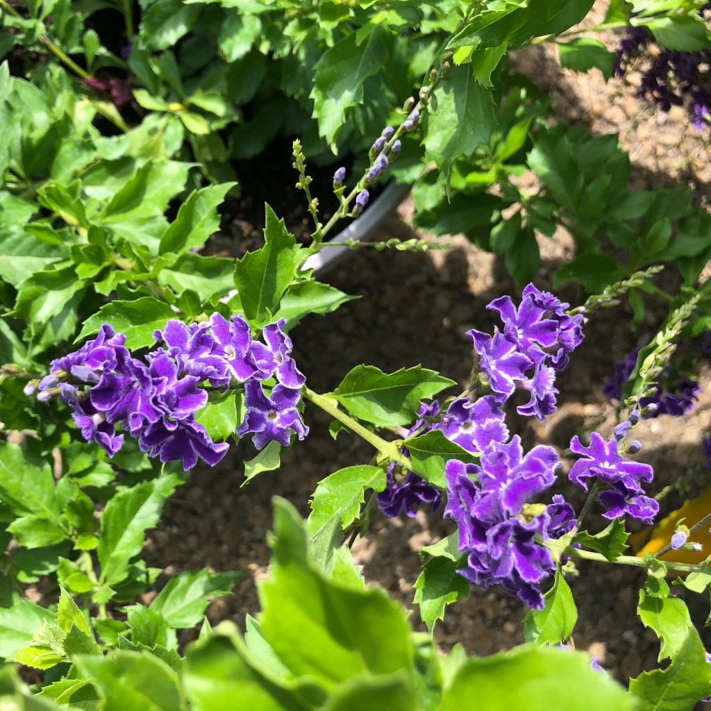 She picked three pretty plants for the area around the mailbox. One the young man at the shop said was a Mexican honeysuckle. The others are purple. I had to look it up. PlantSnap said it was a golden dewdrop. Okay. Duranta erecta is its name and it will be big and thorny. Oh my. But it’s native to Mexico, so it may not make it through the winter.