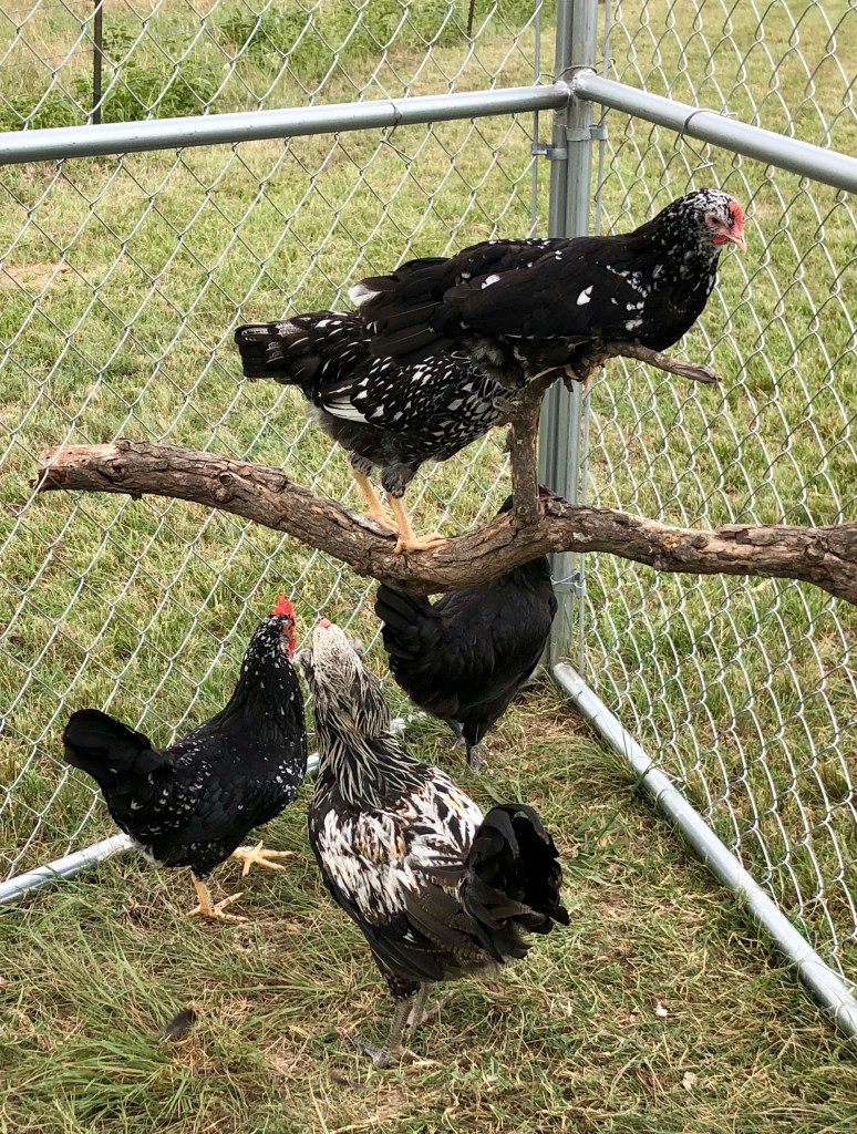 The panicked flock is now well inside the chicken run, where Bruce is guarding them, along with his gals. They are happy to have grass and bugs to enjoy, and they can bond with the chickens.