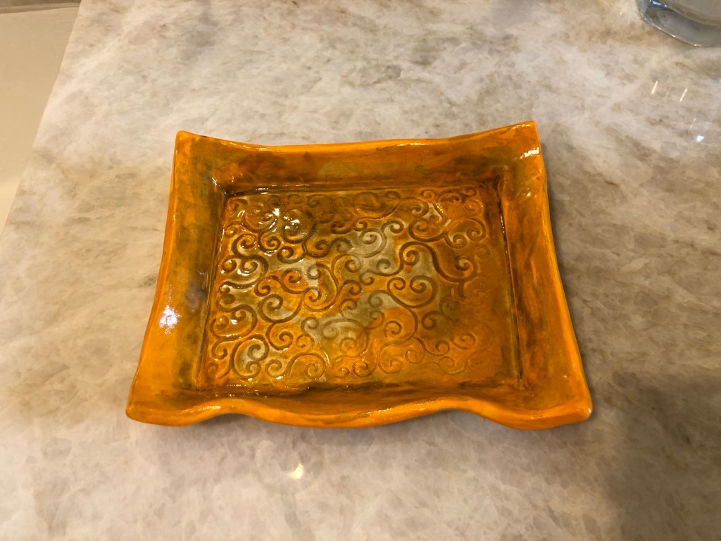 Quick update. My friend Pamela dropped off my finished soap dishes yesterday. I was happy to see how shiny they were, but not overly thrilled with my glaze, as usual. Still, Pamela’s designs are pretty, and they will liven up my bathrooms.