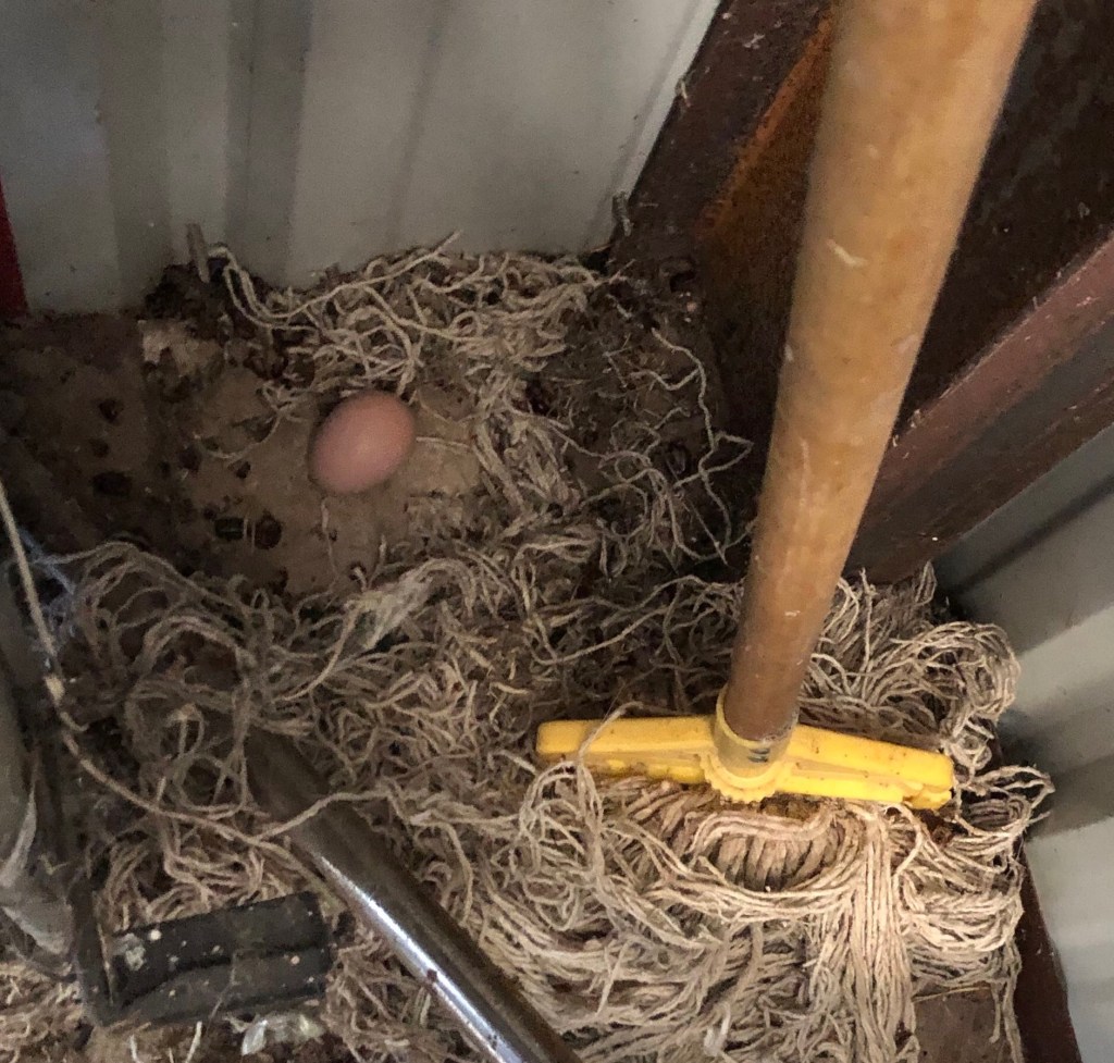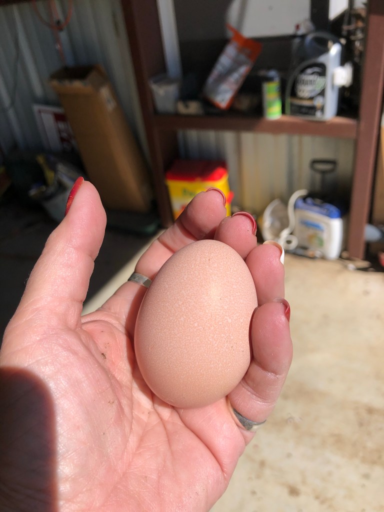 Lee says he sees hens in weird places. Sure enough, I found two pink eggs in the far left corner of the garage.