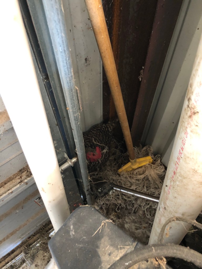 We looked in the rest of the garage, and there was Bertie Lee, sitting on a mop, in the far right corner of the garage.