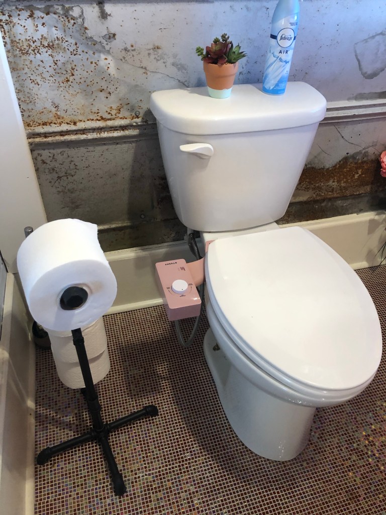 It turns out to be a pretty cool product, and costs way less than an actual bidet. I might get one for my other bathroom. By the way, I just got a pink one to be weird and go with my office color scheme. There are nice white ones. You can also get one with warm water, and many accessories, like a portable one (it’s a spray bottle, duh), their version of the Squatty Potty, and even their own toilet paper.