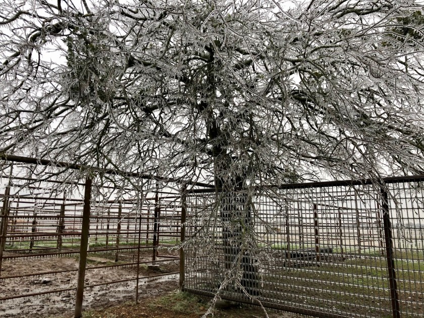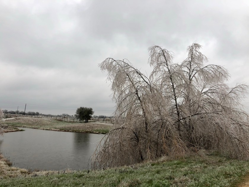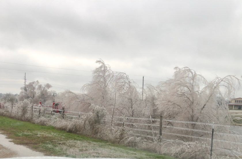 One thing I realized when I was driving to Rockdale for the vaccination is that up here in Walker’s Creek/Silver City (or wherever I live), we got much more ice than only a few miles south of us did. Some of Rockdale’s trees looked perfectly normal. On the other hand, there are lots of trees down here (and my friends in northwest Austin really, really had lots of damage).