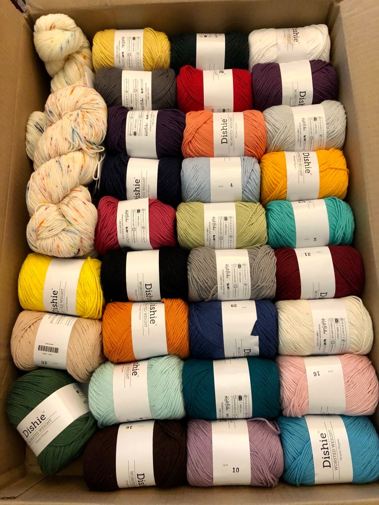 But, Lee has a point. I’ll up my game, at least a bit! After all, I have supporters. I owe it to them. Ooh! And I owe them their benefits! I’m ready to start making dishcloths, too! A big box with one skein In every color of Dishie cotton yarn arrived today.