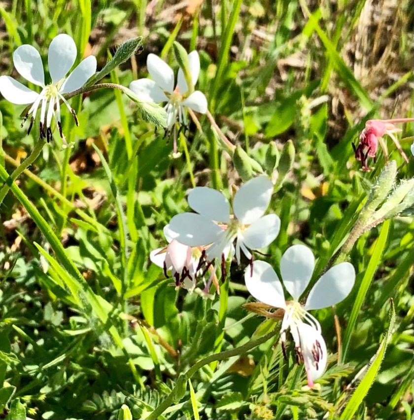 The Indian paintbrush that usually covers our front field and the one down the road are nowhere near as numerous as usual, but the fact that there are some gives me hope for future years. The bluebonnets are okay in numbers, but I haven’t seen a winecup yet. The delicate roadside gaura (Oenothera suffulta), however, has managed to come up, in such a pretty stand that I thought they were some other flower.