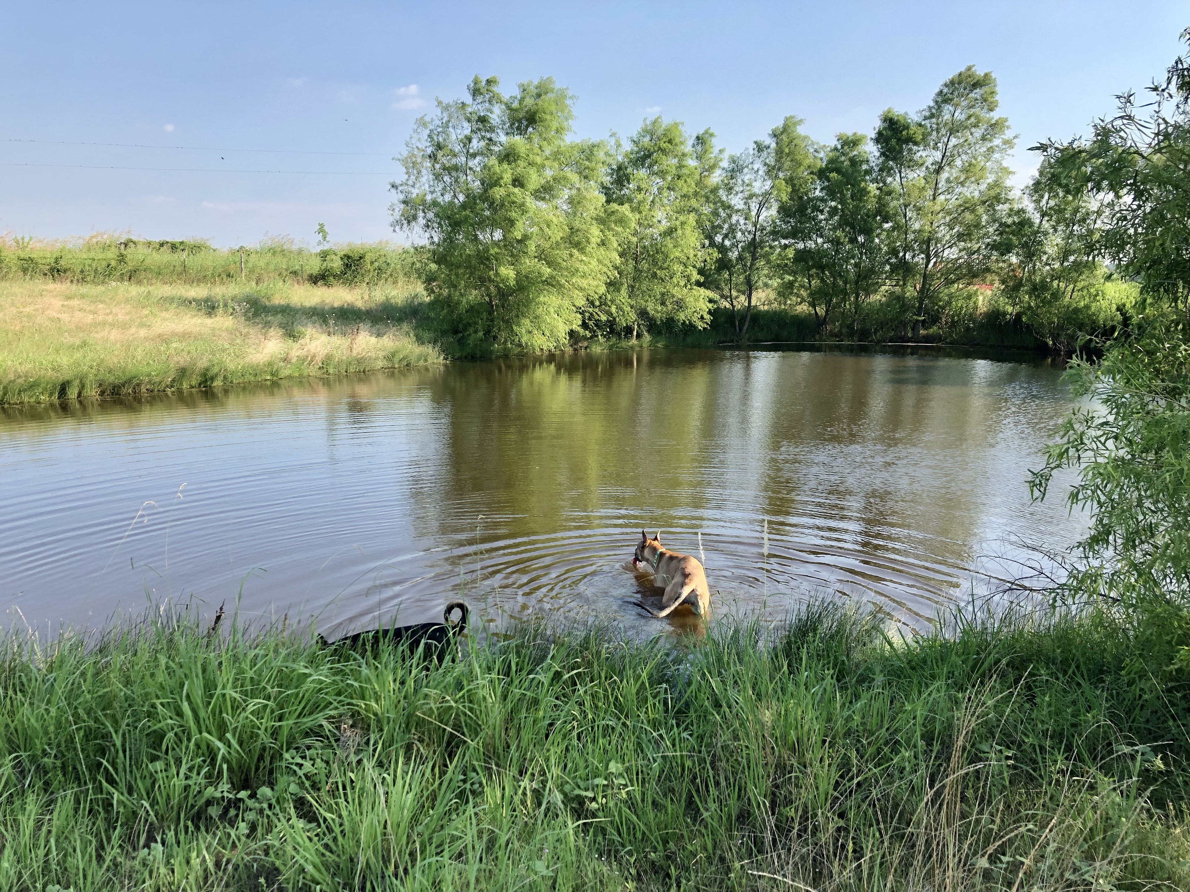 Alfred and Goldie looked like luxury liners out in the big pond. After explaining to the two guardian dogs that they did NOT need to bark at one of the cows, we all ran back. Well, Alfred and I walked.