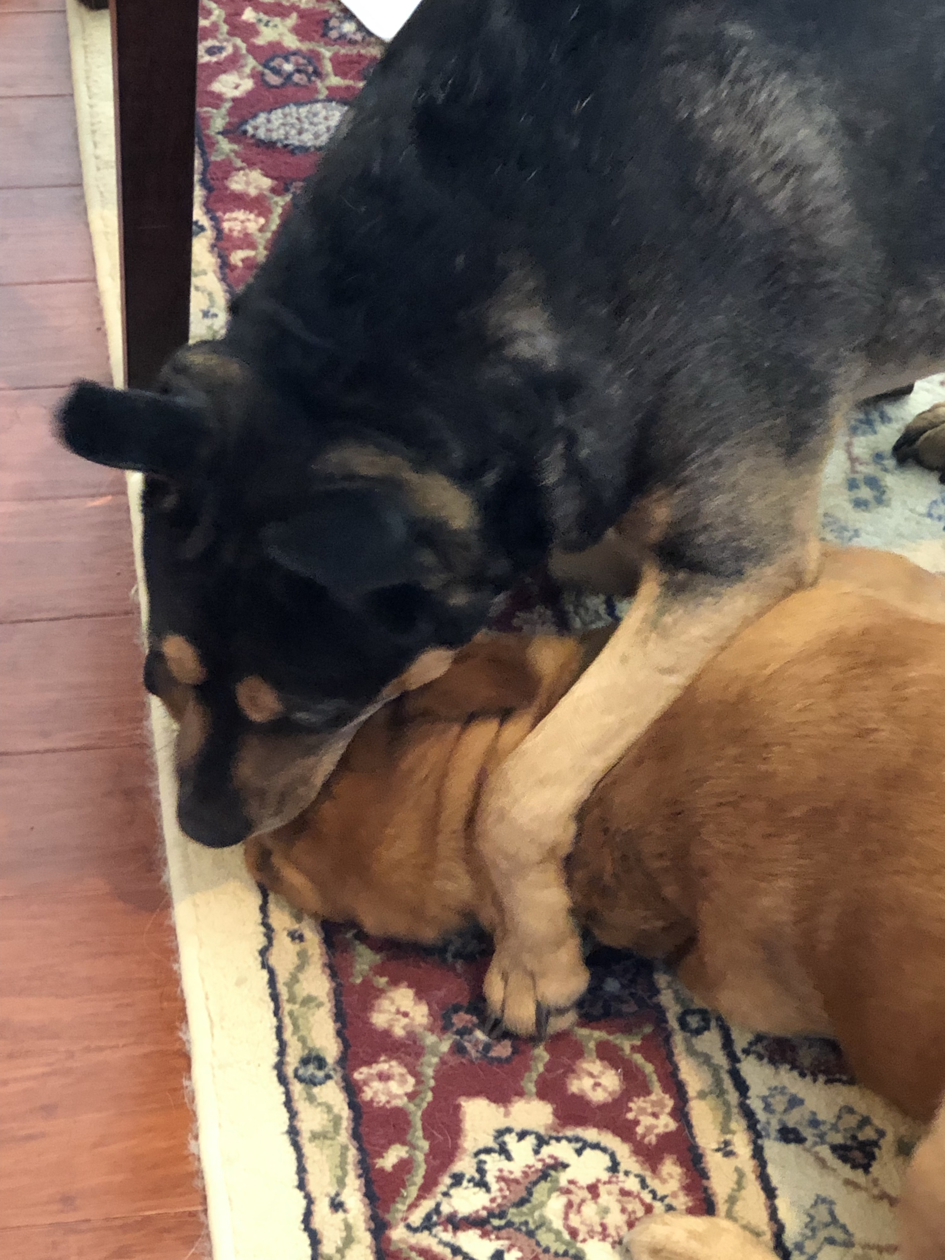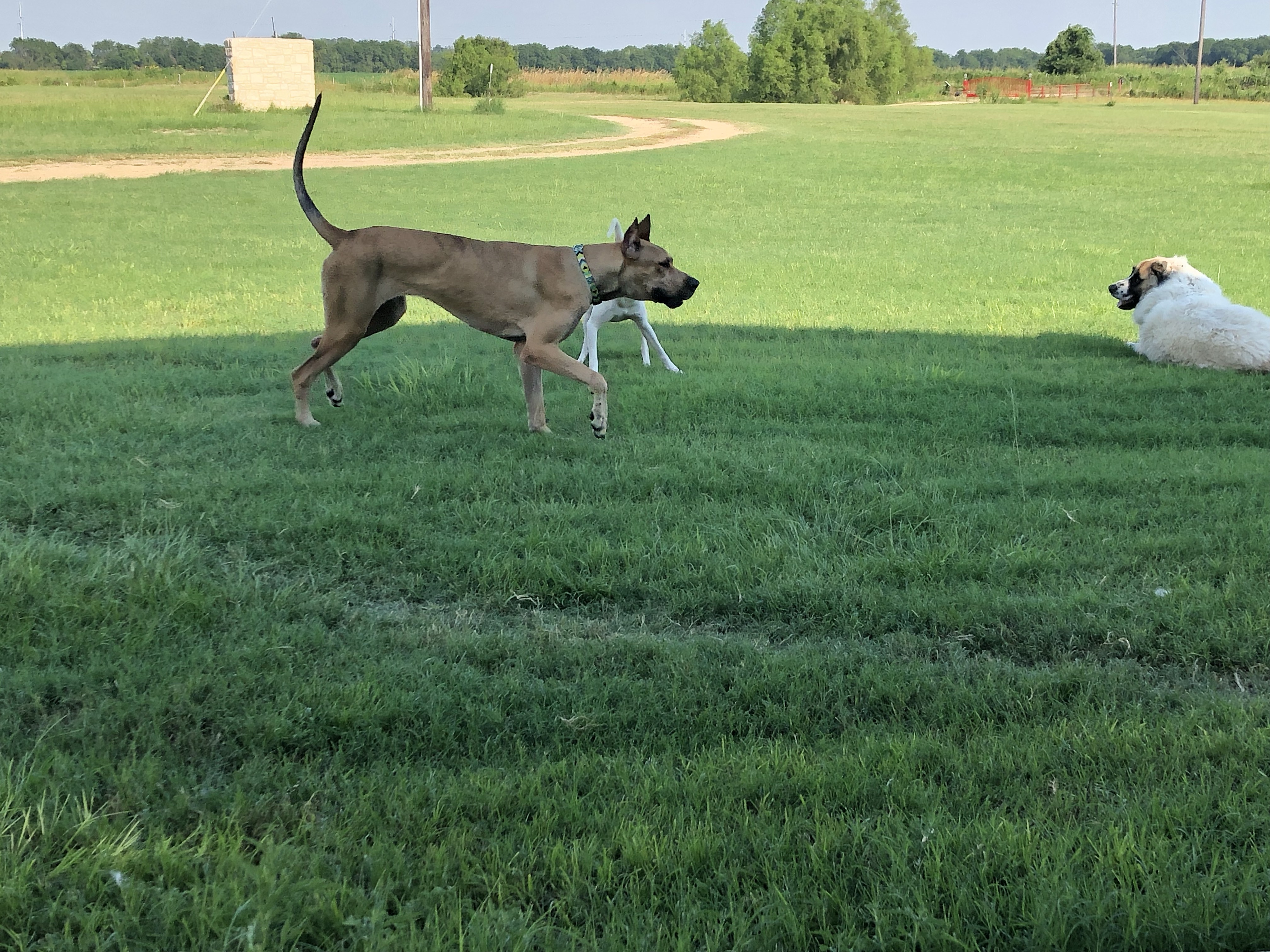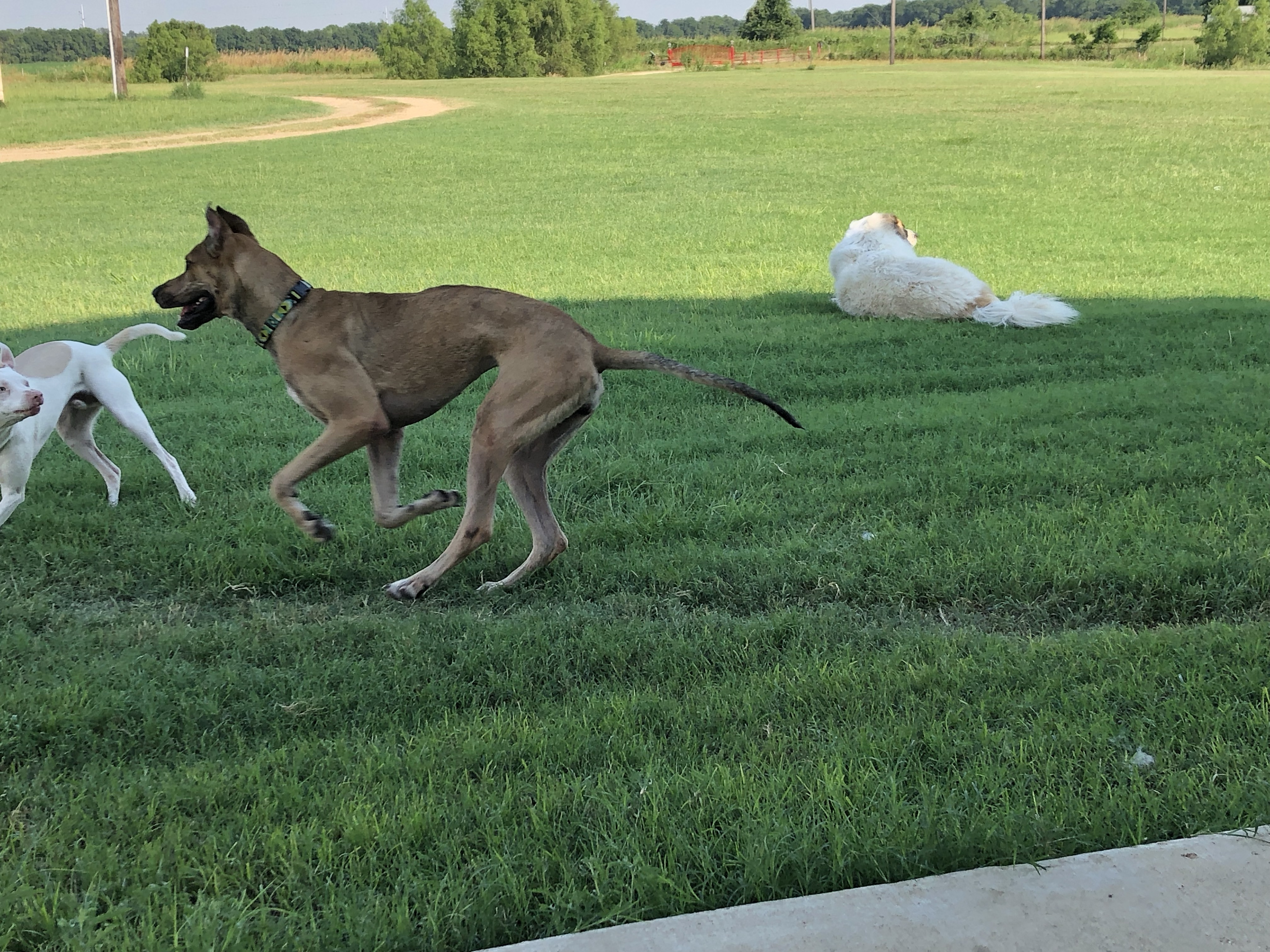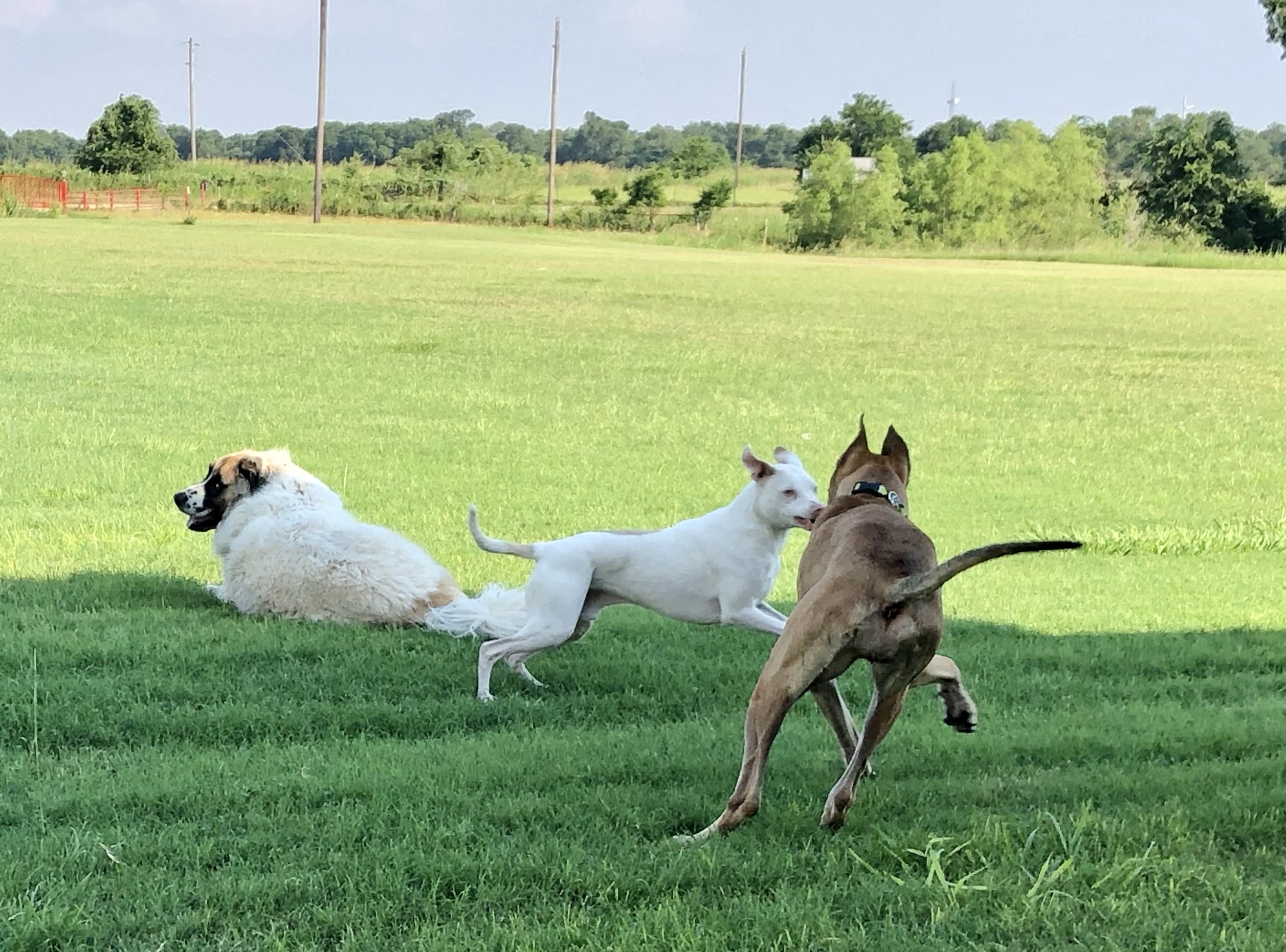I sat on the porch for a while to enjoy the breeze. Since the dogs were cooler, they could play. Carlton and Goldie looked like they were dancing.