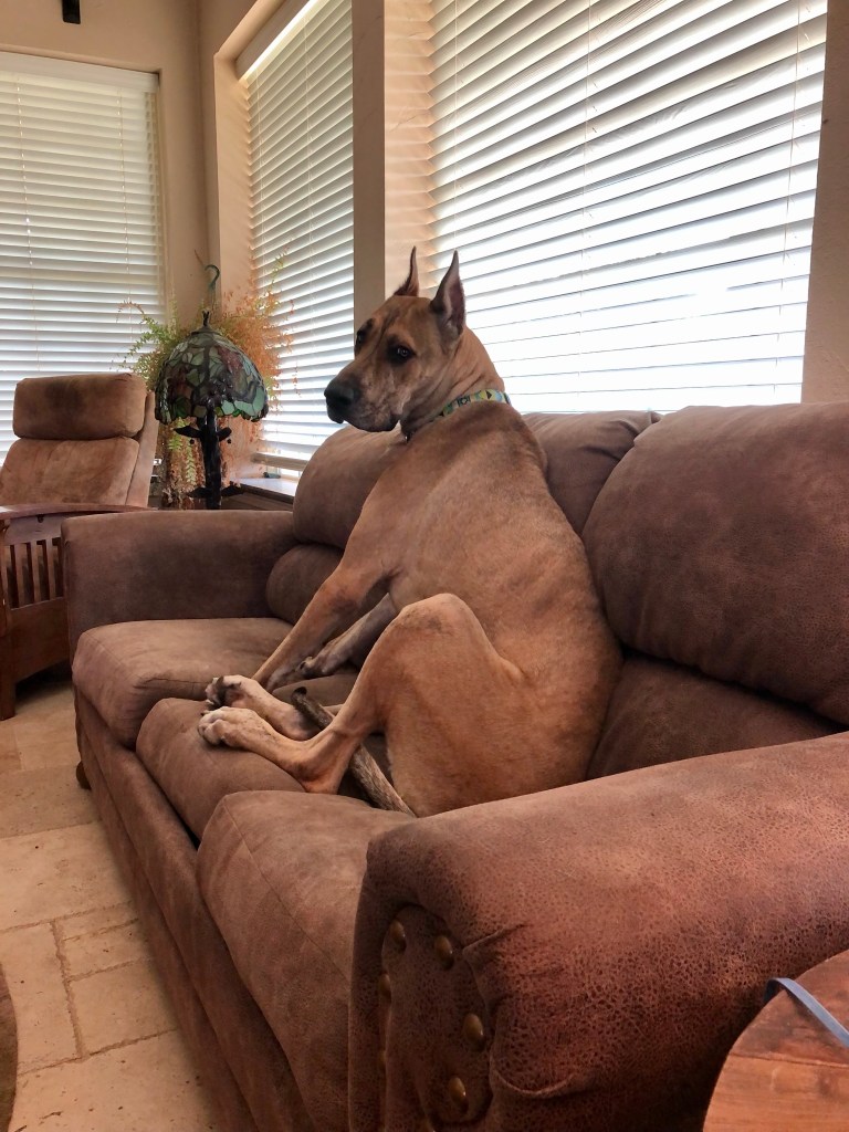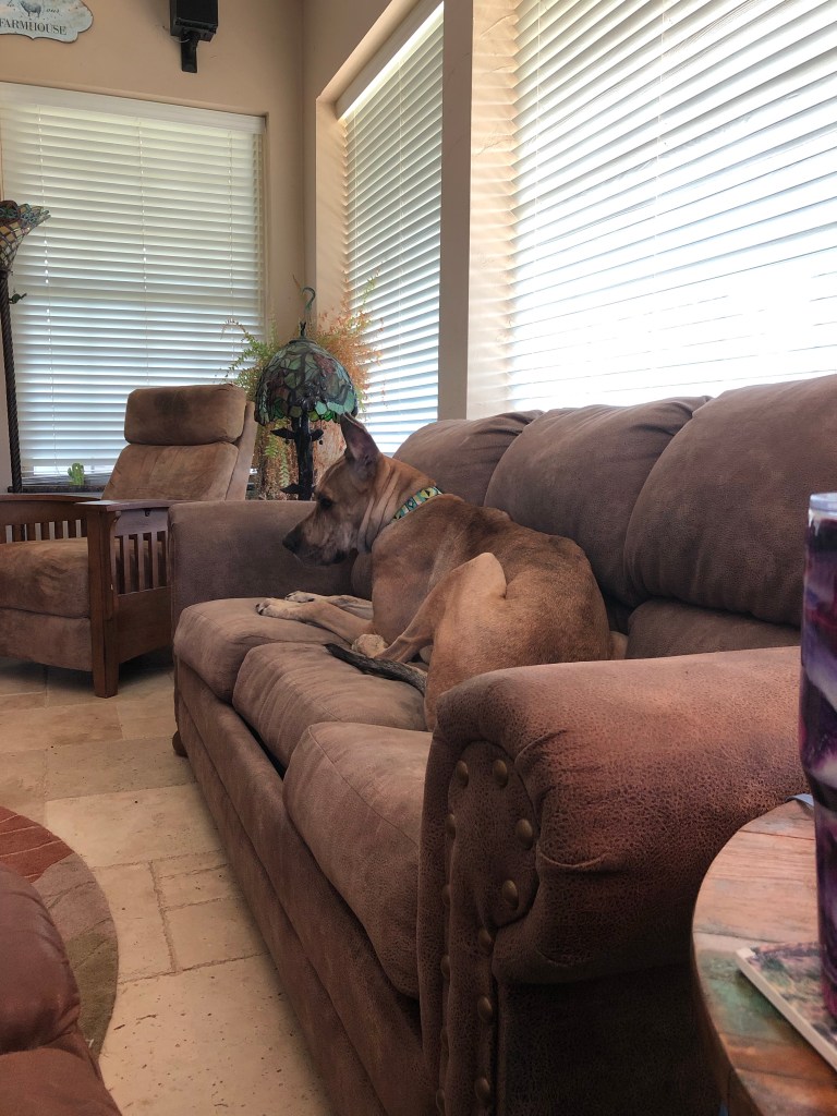 Then she and Harvey joined Lee for some couch chatting time while he ate his breakfast. It was, I guess, cozy. Good thing she is gentle with furniture.