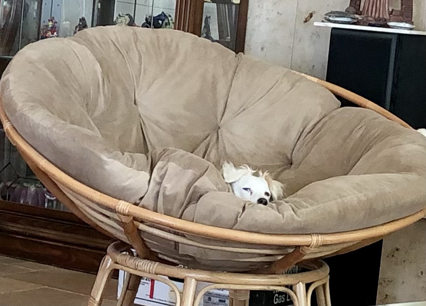 Gracie, the littlest Hermits’ Rest dog, spent the afternoon on the porch in her favorite chair. But she did get exercise. She moved to her favorite INDOOR chair. Cutie.