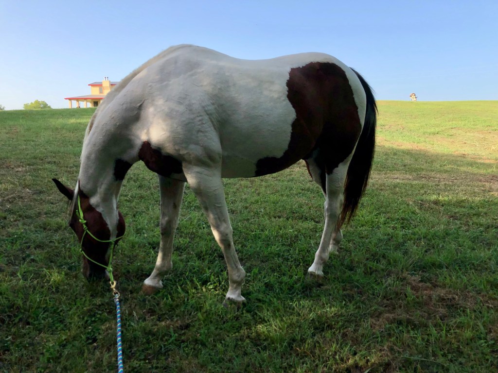 I then tried to ride Andrew. I managed to eventually get the saddle and bridle adjusted for him. And he did okay in the round pen, but will now only go one direction. Anyway, I mounted, and he acted all barn sour and was hard to get to move out. Eventually he followed Dusty some, but I had to hood on through some spooking, and he crowded poor Kathleen and Dusty. In the end, Kathleen walked us around until neither he nor Dusty would do anything but investigate a feed dish. I’ll try another day. Who knows where the issue lies? I need help, but will get it soon.