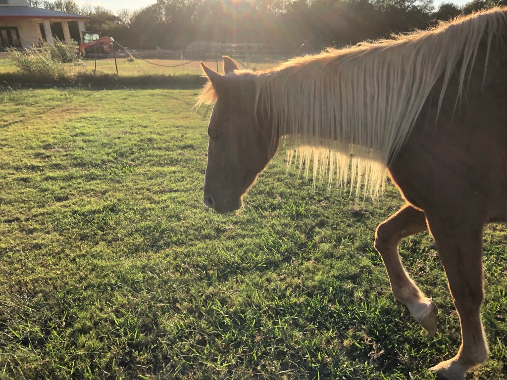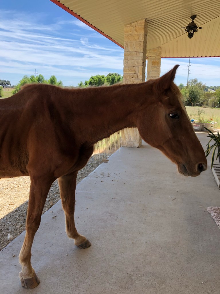 No, she could not, because part of her old lady issues includes peeing a lot, all the time. But you know what? It’s nice having her around. She can’t kick and bite the other horses this way, but she gets lots of human love on her skinny frame. We will take care of her as long as possible, too. Kathleen has her closely monitored by veterinarians.