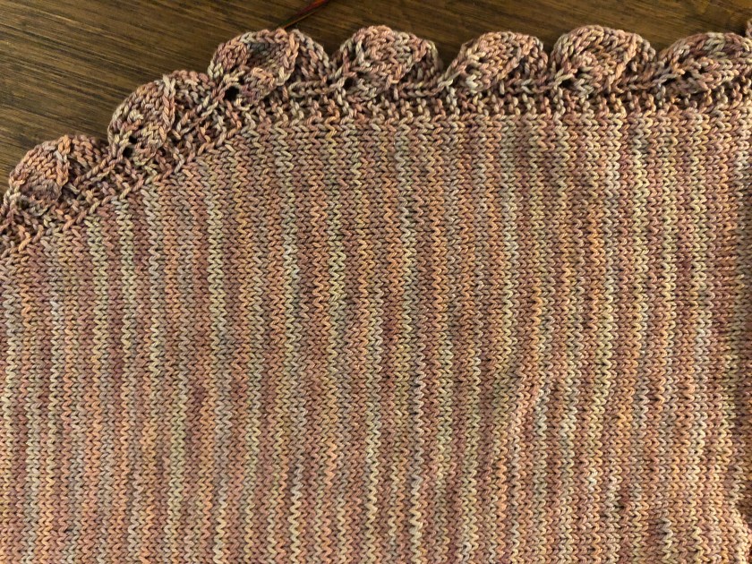 Kathy was a fan of ripping it out and starting again. I think if the baby wasn’t coming sooner and if I hadn’t really disliked knitting with that particular yarn, I might have done so. Her next suggestion was to just add another wedge to it, and see what that does. I think she had a good idea. I’m pretty sure I have enough yarn for another wedge, and if it curves around a little more, it could be a little baby wrapper, or maybe when she’s older a “hug” she can wrap around herself. That makes me feel better.