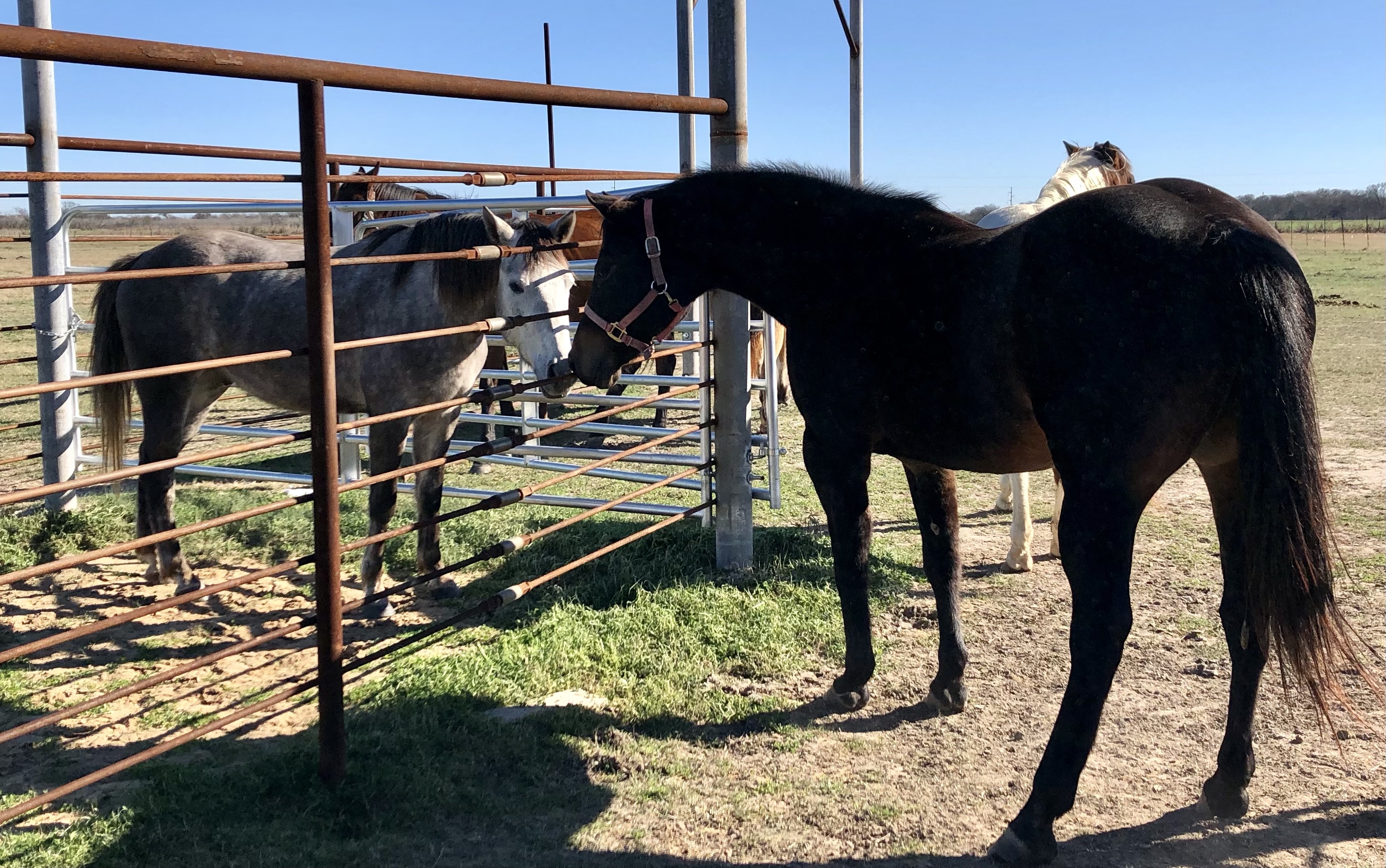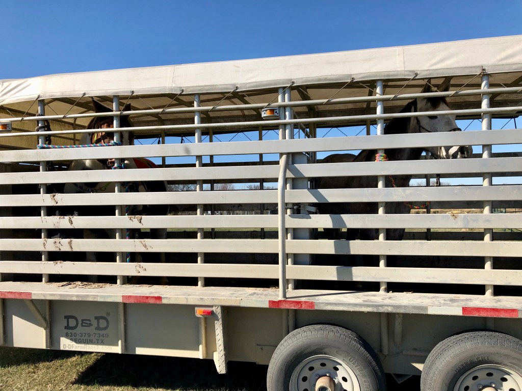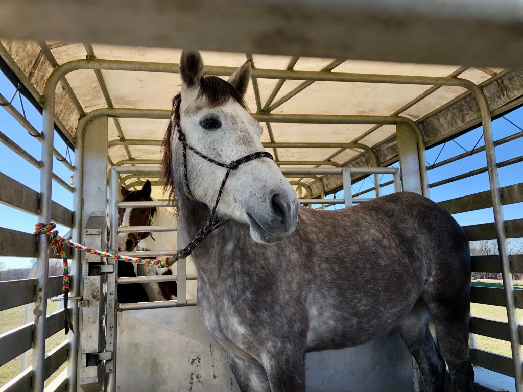 We made it home and everyone exited nicely. Drew is installed in the small fenced-in area as he gets used to the other horses. It all seemed to be going well.
