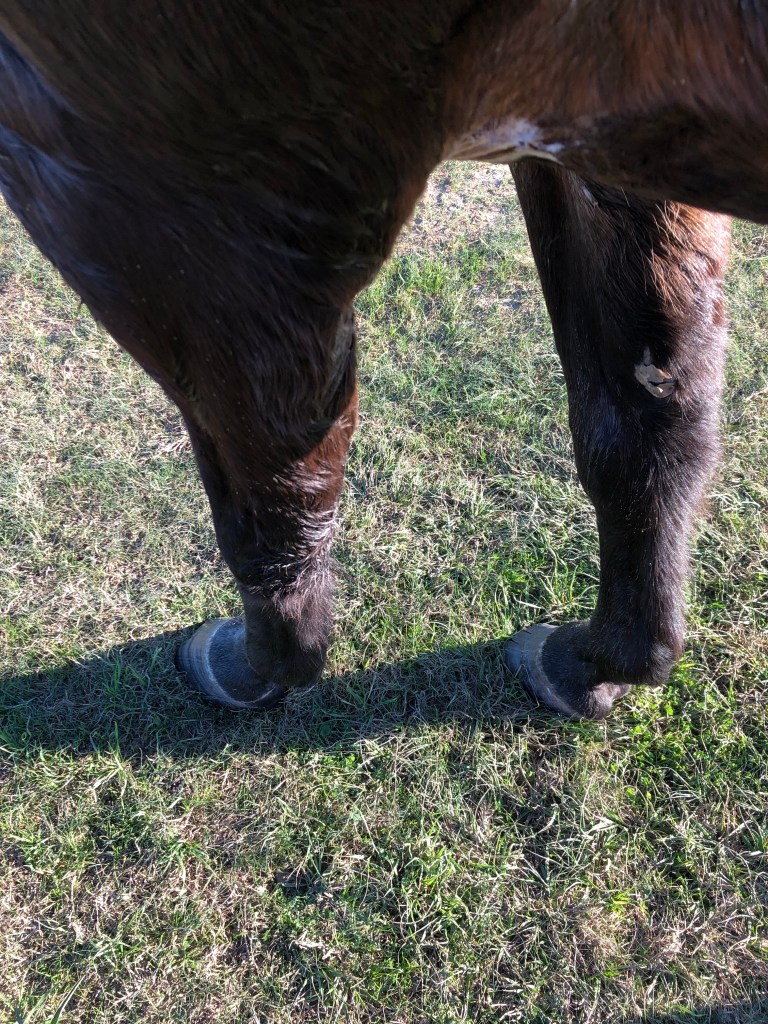 When we got home I looked to be sure all the horses were okay, as usual. That’s when I spotted T way down the fence, holding her left front leg up. That looked odd. I quickly guessed that she had somehow gotten her leg stuck in the fence, which I thought was a safer kind for horses.