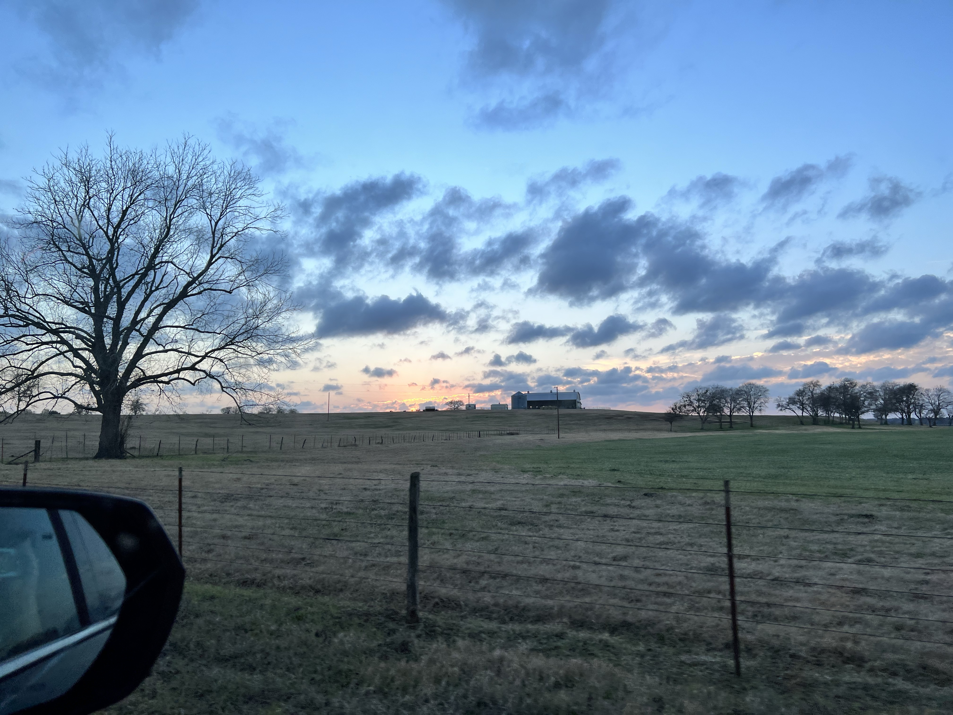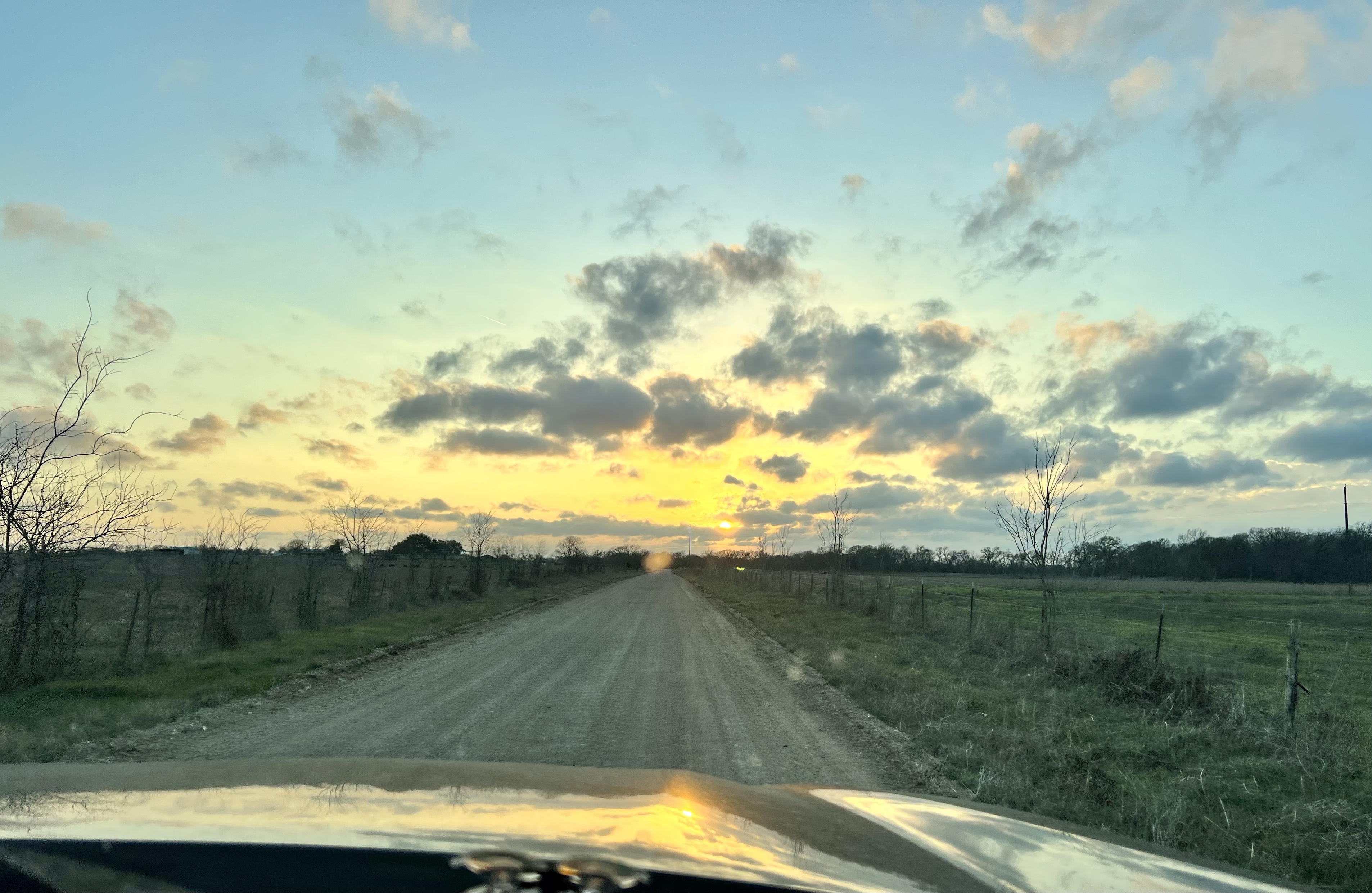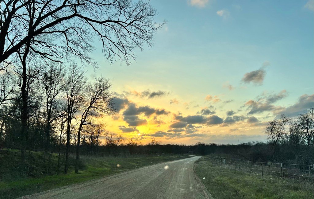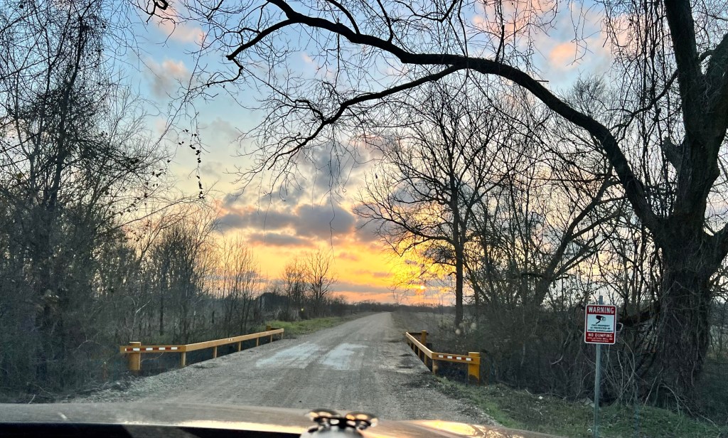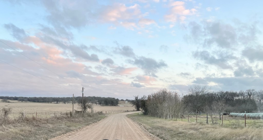 We were happy to realize that the sun was setting, which made our little drive almost magical. It was one of those sunsets when the sun went in and out behind clouds. Plus this road is a gorgeous well maintained dirt road, so it was fun to go down. We figure a county commissioner must live there, since our county is one of America’s great centers of potholes.