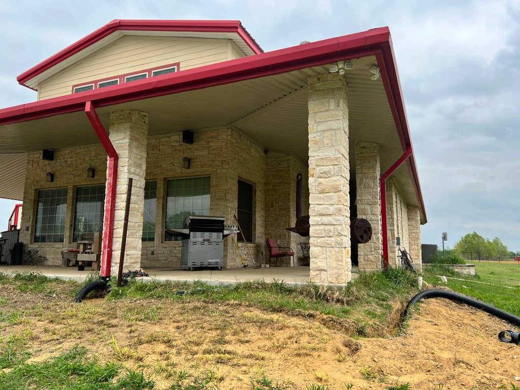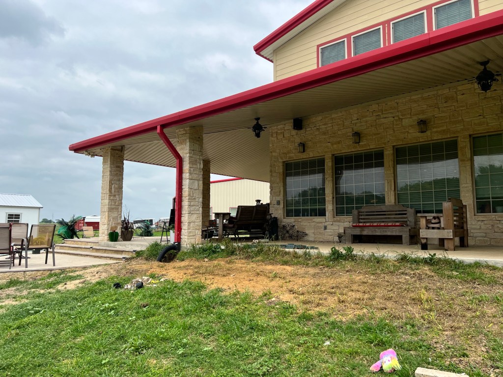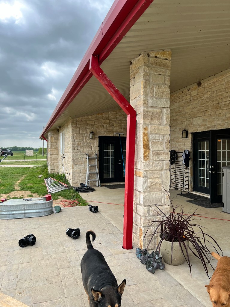 Today our crew got to work on a long-awaited home improvement task: installing gutters on the back of the ranch house. Now, we’ve had the gutters since we built the house; they were stored in the shipping container.