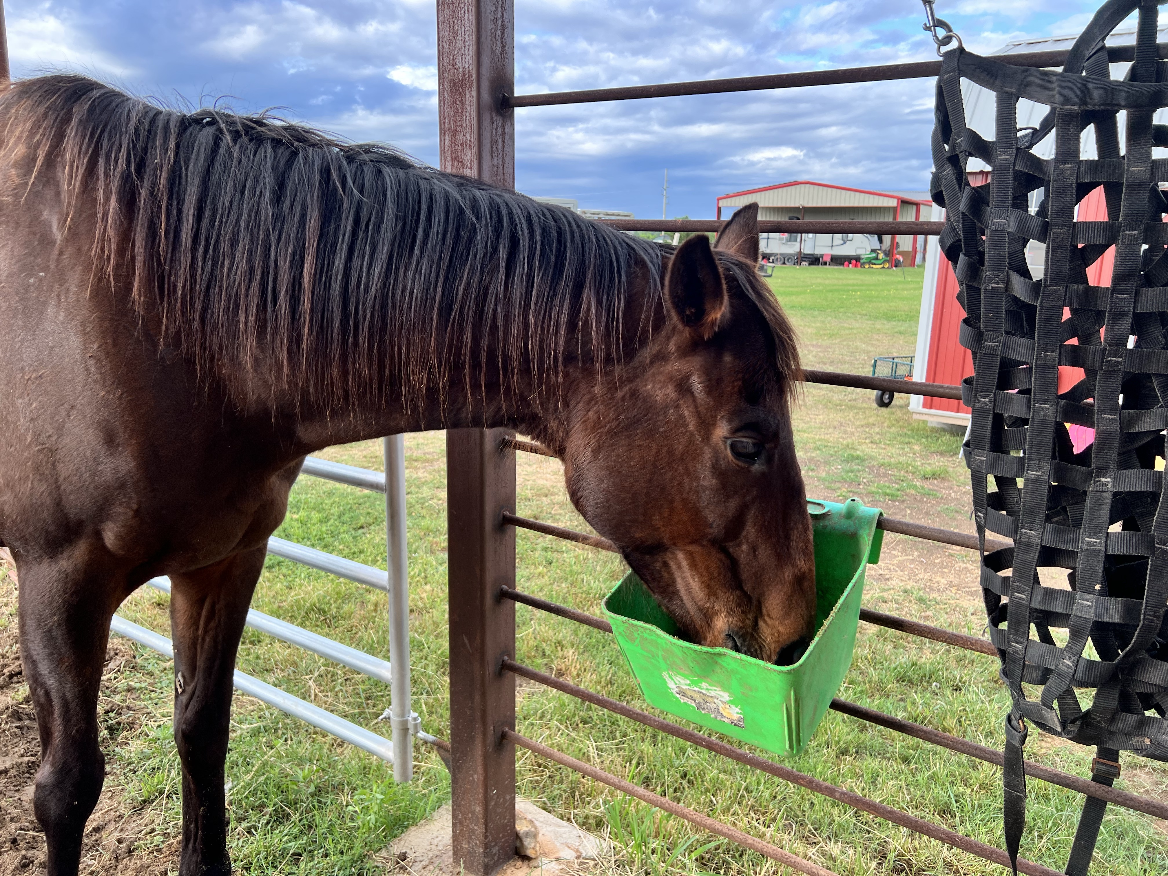 I’m glad that excitement ended quickly. Earlier, on my morning feeding break. I realized that Mabel was patiently standing in one of the pens while Drew ate his morning calorie dump. I’d been planning to try to give Mabel extra food, too, once we had fewer horses to wrangle at feeding time, so I went and got her some alfalfa and coconut meal, wet down with a lot of water.