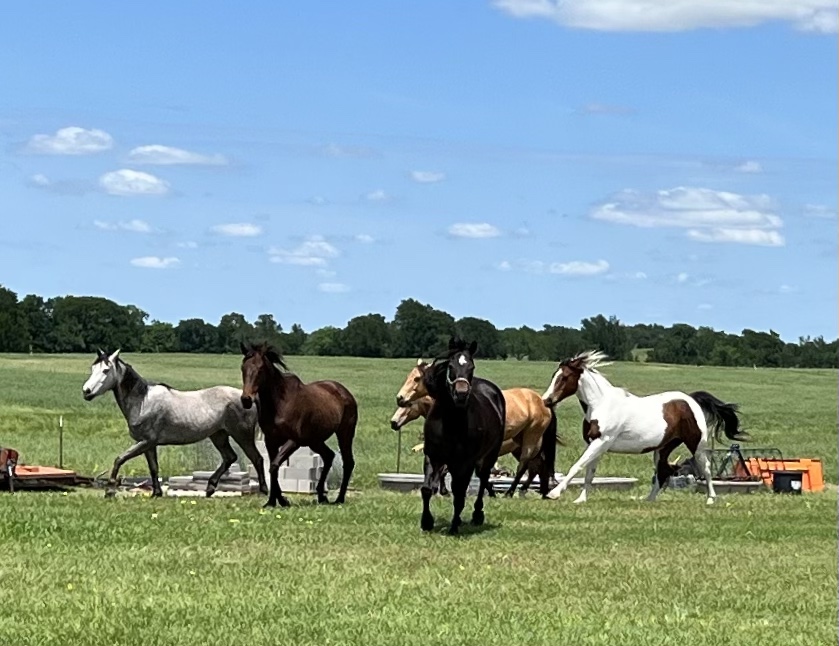 I soon found out why. There was a thundering herd of six horses and one small, spotted donkey running across the front field, looking majestic AF. Oops. I fetched my non-computer glasses and my phone and ran out to see how that had happened.