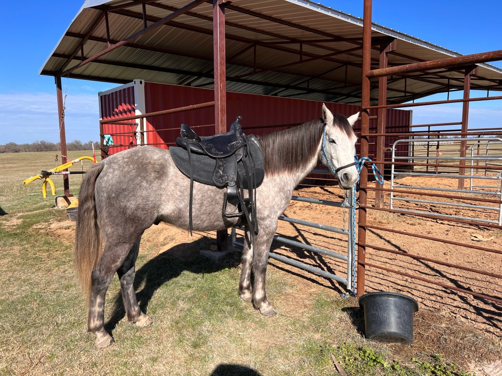 On the way back, along the exact same trail we took to get to Sara’s, he kept breaking into a jog and acting like he forgot I was there. So I repeatedly reminded him, just like I’d been practicing. By gosh, he settled down and walked to the gate and was calm once I got off to walk back. He’s making great strides.