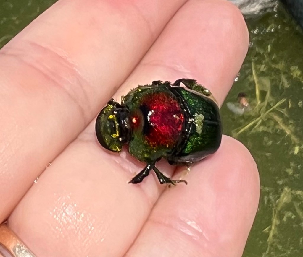 Yep, it pays to be observant, even when you’re just relaxing behind the house. It pays to look around in the water trough, too. That’s where I found the beetle.