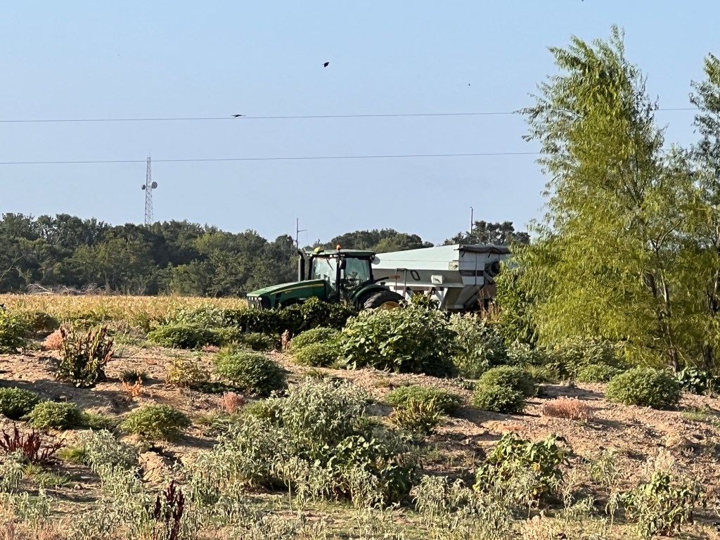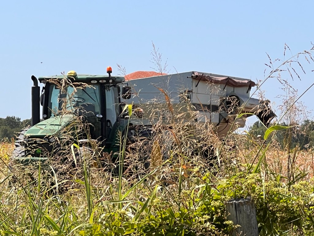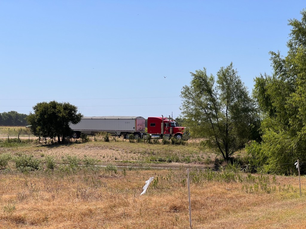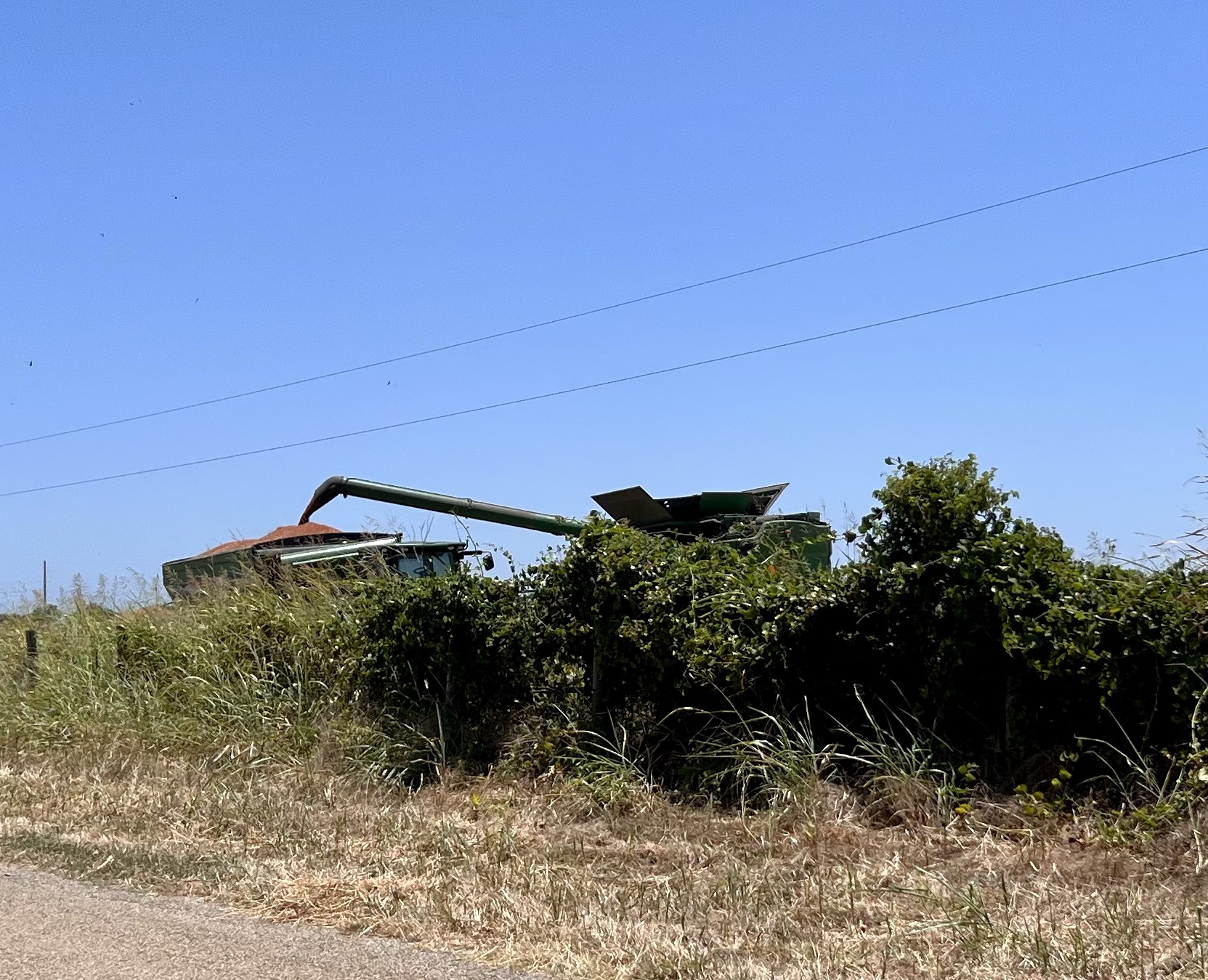 Hoppers showed up next. The big harvester shoots sorghum into the hoppers periodically, then goes out and gets more seeds. Soon, very large semi trucks arrive, and all the hoppers get emptied into them. They take the grain away to wherever grain goes.