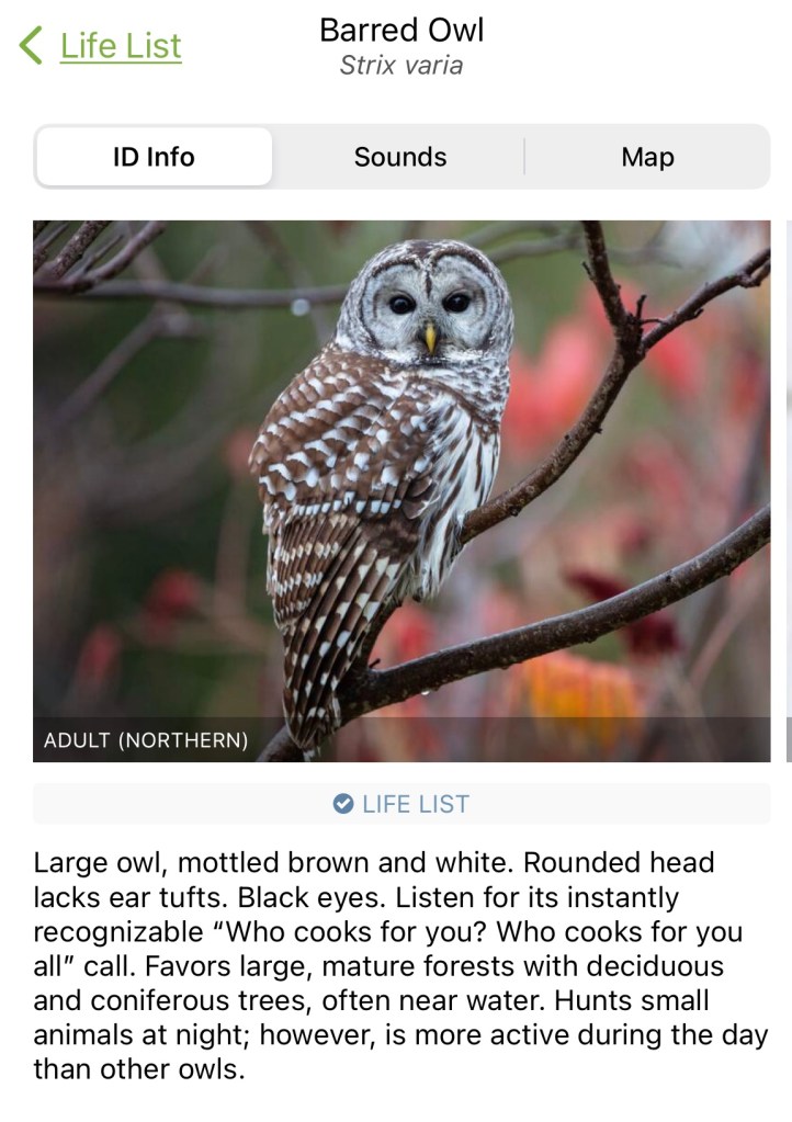 The Daily Bird for today is the Barred Owl. Today I finally got one recorded on Merlin, so it’s on my “life list” there (though I’ve been familiar with them since I moved here). They are gorgeous birds and I love listening to them go “who cooks for you?” Over and over.