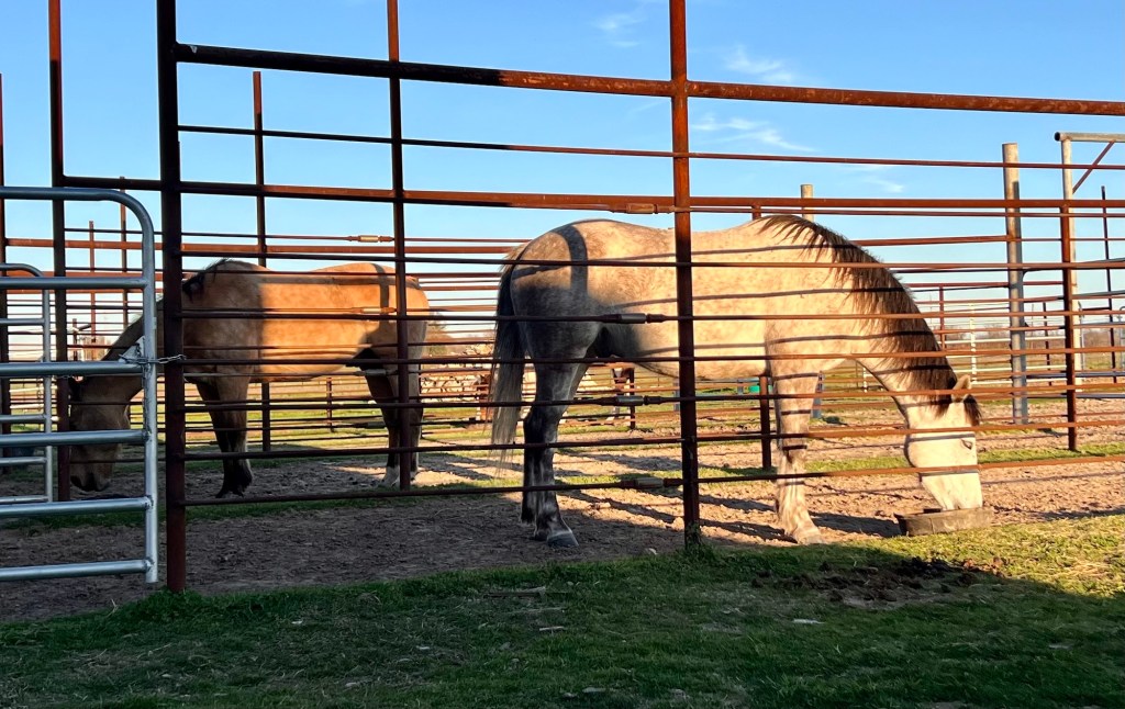 Apache has had foot problems in spring because of new grass. It’s why they’re staying on the pasture that has the least grass. But it will be interesting to see how he does at the trainer, where he has turnout but eats mostly hay.
