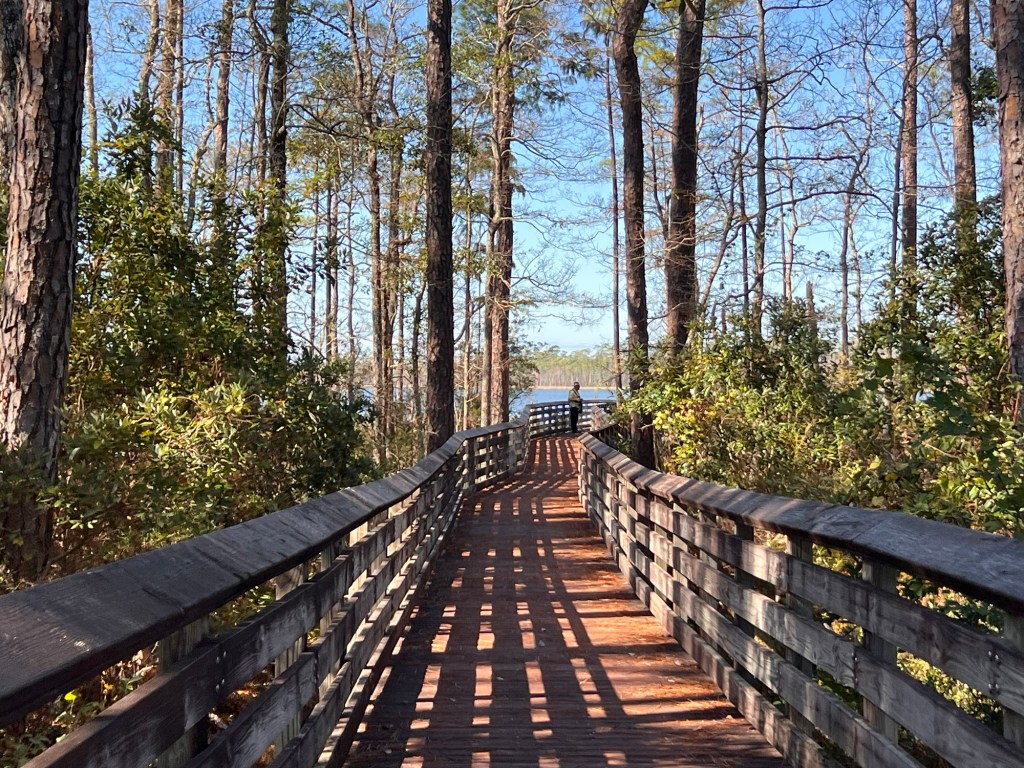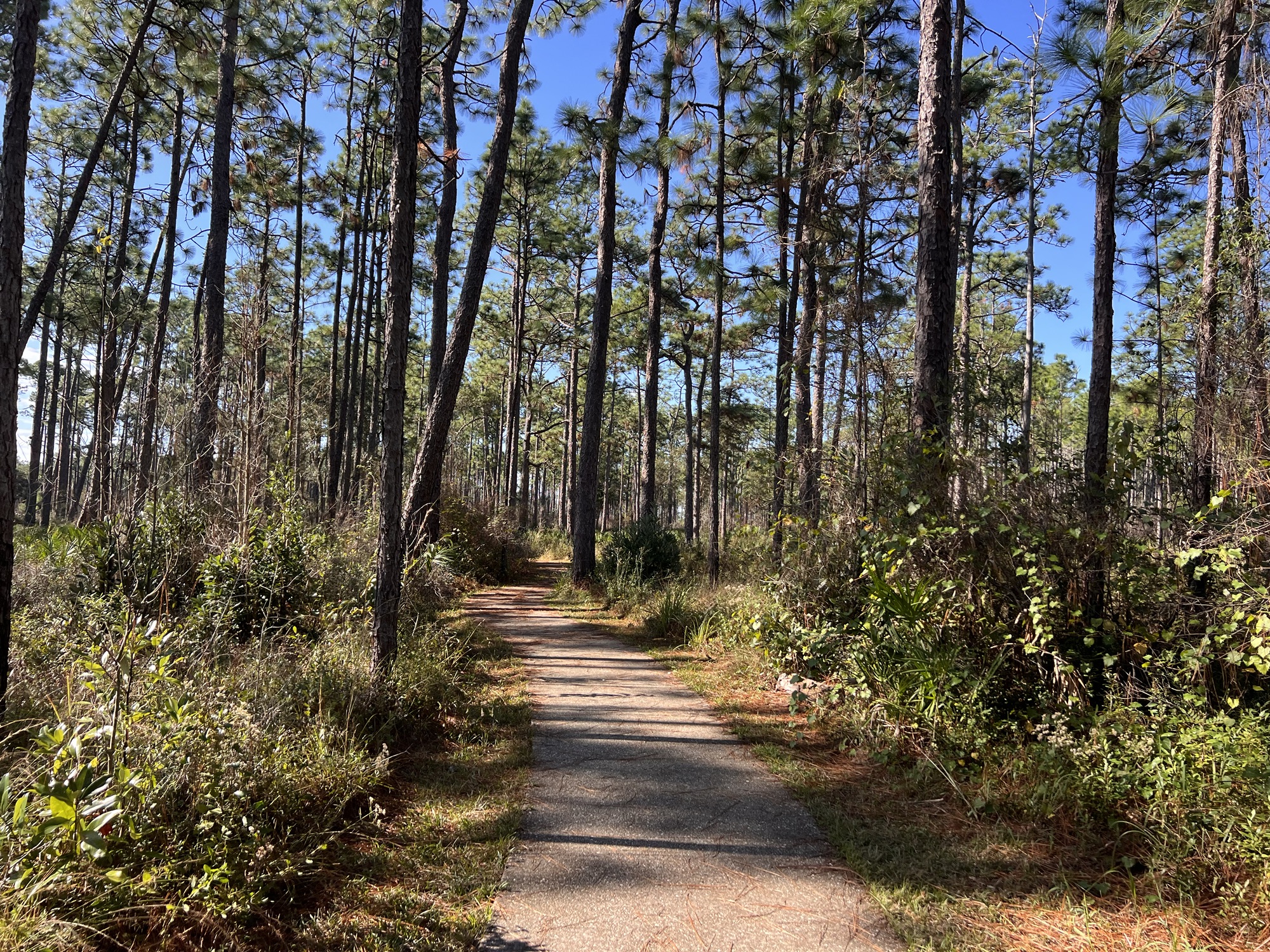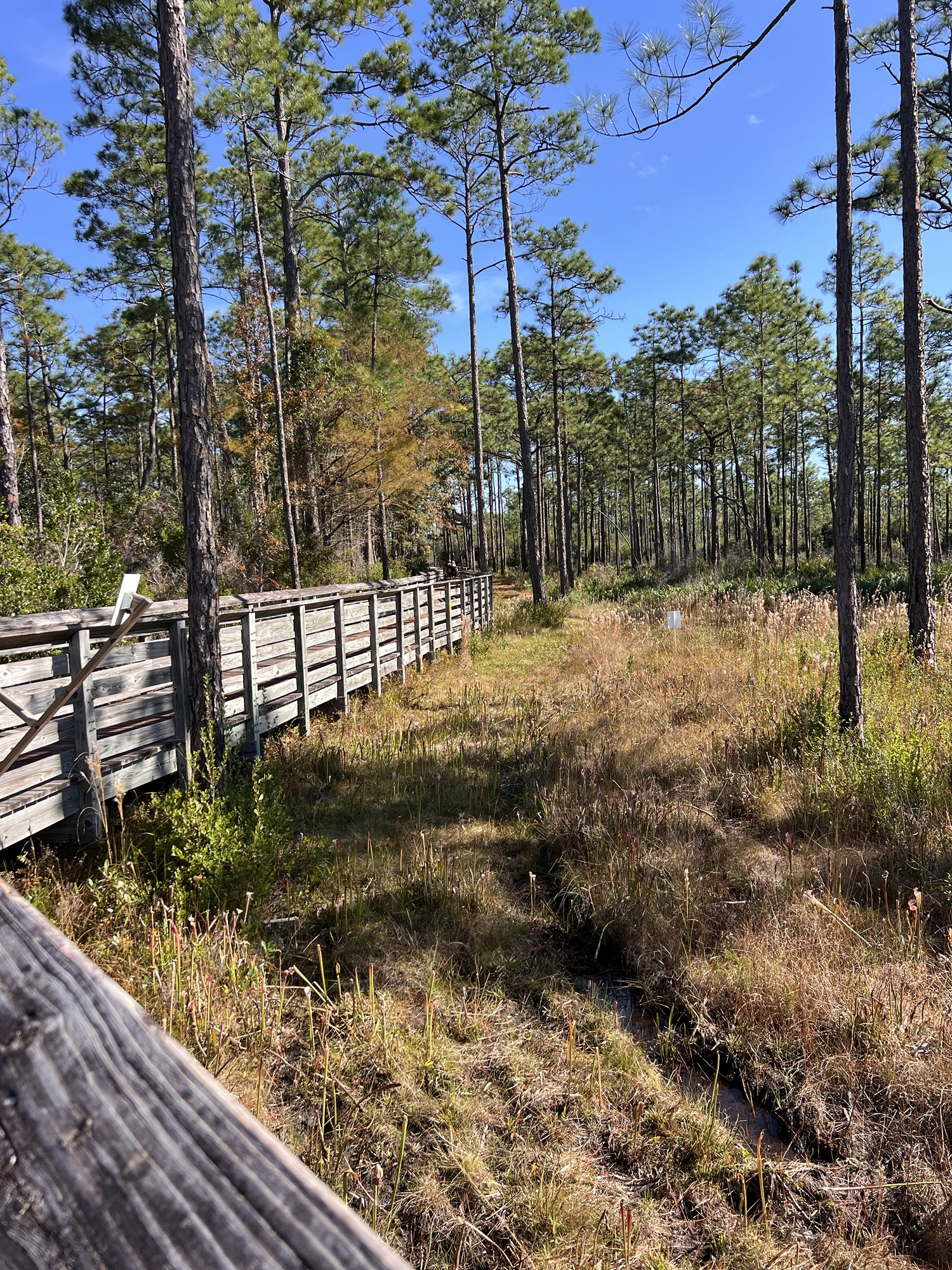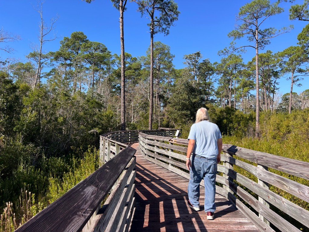 You see, today we had some extra time, because this is our short driving day. Lee suggested we find some places to look at nature. I found a state park in western Florida that said it had a boardwalk that had views of pitcher plants. They’re carnivorous! So we headed off through some beautiful coastal scenery to the well hidden Tarkiln Bayou Preserve State Park.