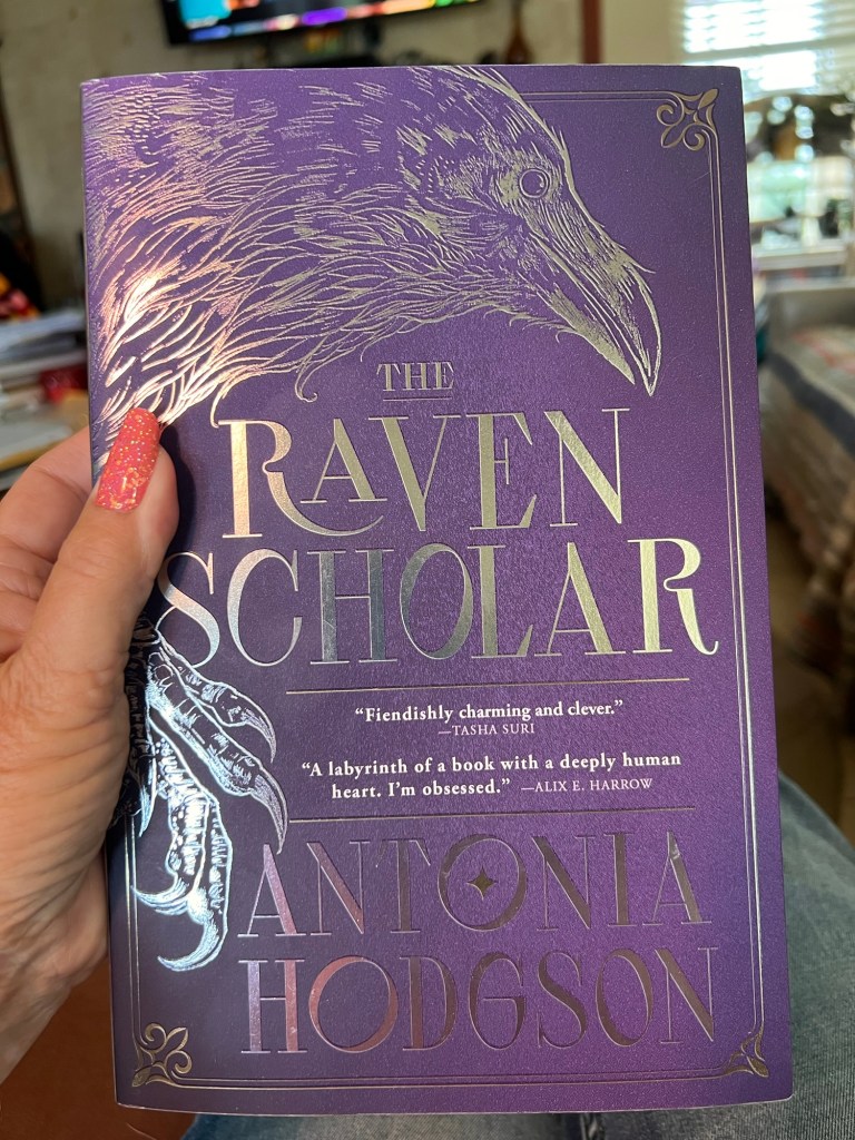 Lee likes to go to the bookstore/coffee shop in Rockdale, so I went with him one day to order a book. The shop doesn’t have a big variety, mostly historical romances and fantasy. I did need something to read, so I looked at all the covers and titles of the fantasy novels, and chose this one, The Raven Scholar, by Antonia Hodgson. It had an interesting cover, was purple, and featured ravens. All good if a random way to pick a book.