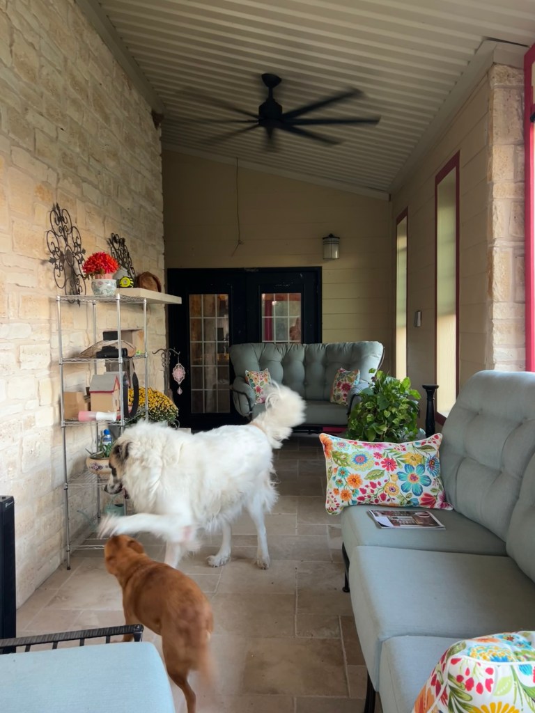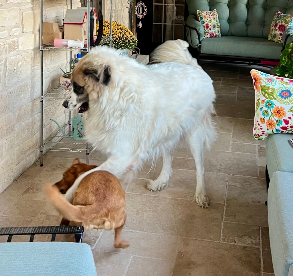 But wait, there IS good news! The electrician people came today and got our big fans installed on the screened porch. It was a bit of work, especially putting the fans together. I had planned to take some calm fan photos, but instead got to record a rare sight, our usually dignified Alfred being playful with Penney. I’ll treasure these images!