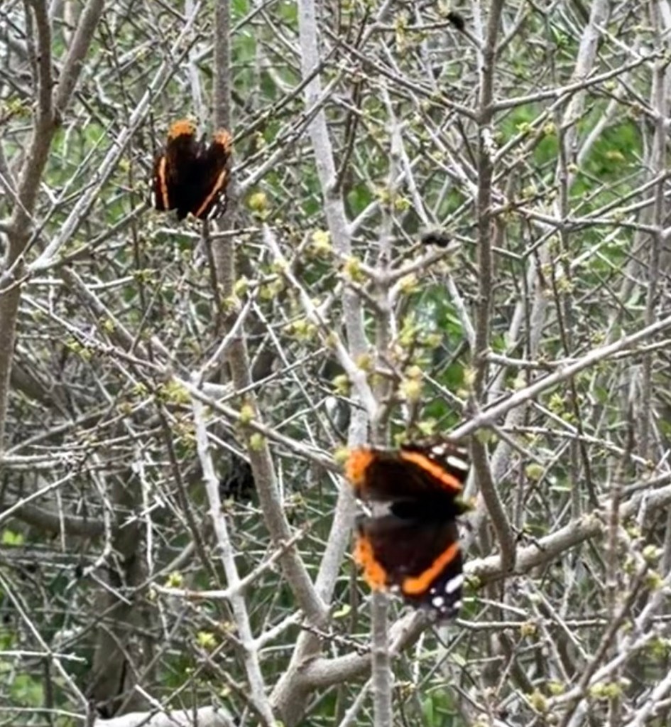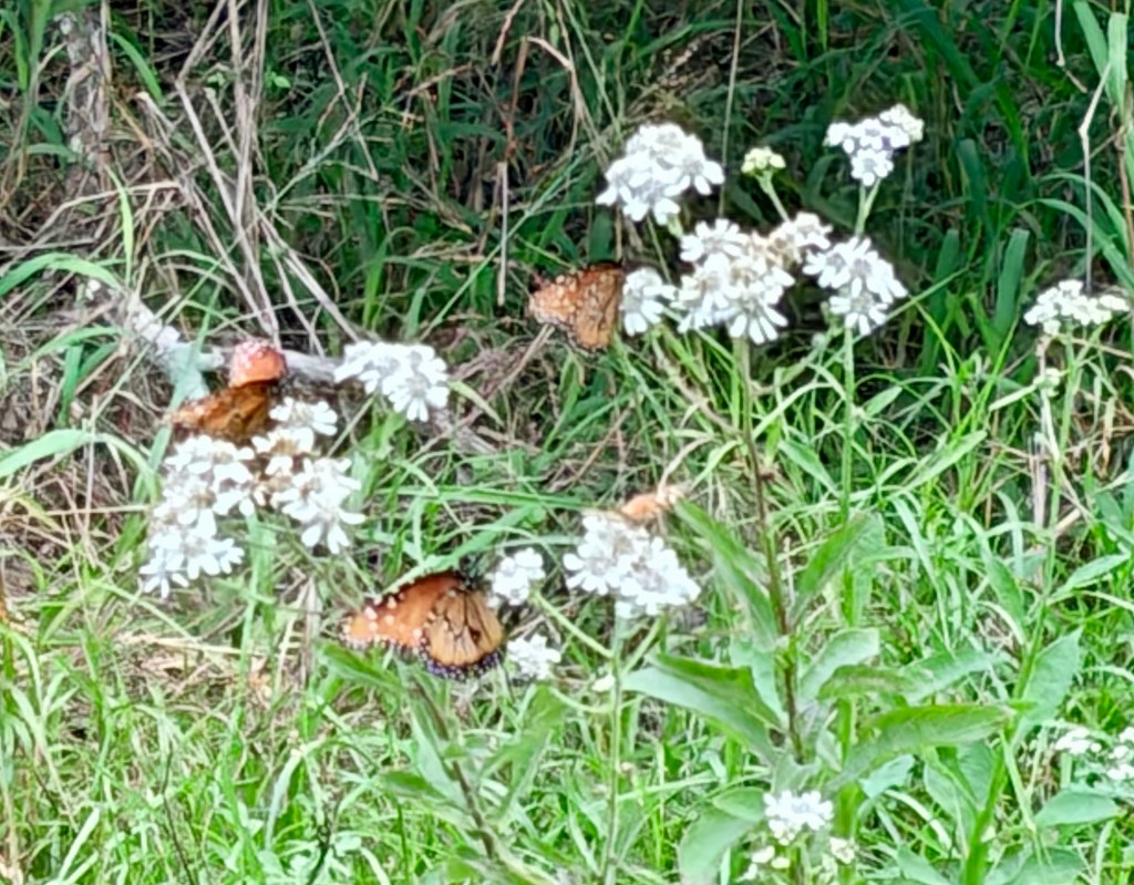 I knew they were blooming because I heard a plant buzzing with pollinators, then I saw dozens of butterflies covering the bushes like ornaments. There were the Snouts I saw yesterday, joined by Queens, Monarchs, and Red Admirals. What a gift to see this reminder that something is blooming all year round here.