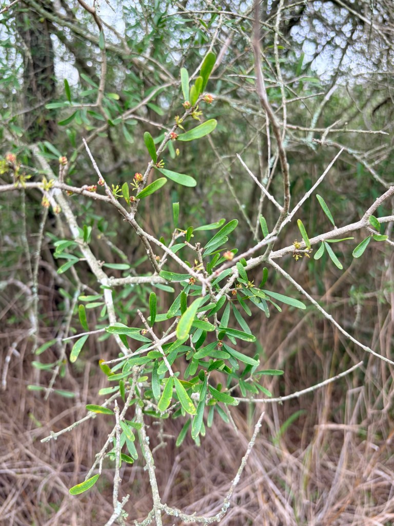 The butterflies were magical, especially around these nondescript plants with tiny blossoms, Narrowleaf Forestiera (Forestiera angustifolia). The blossoms may be tiny, but butterflies, bees, and even flies love this source of winter nectar.