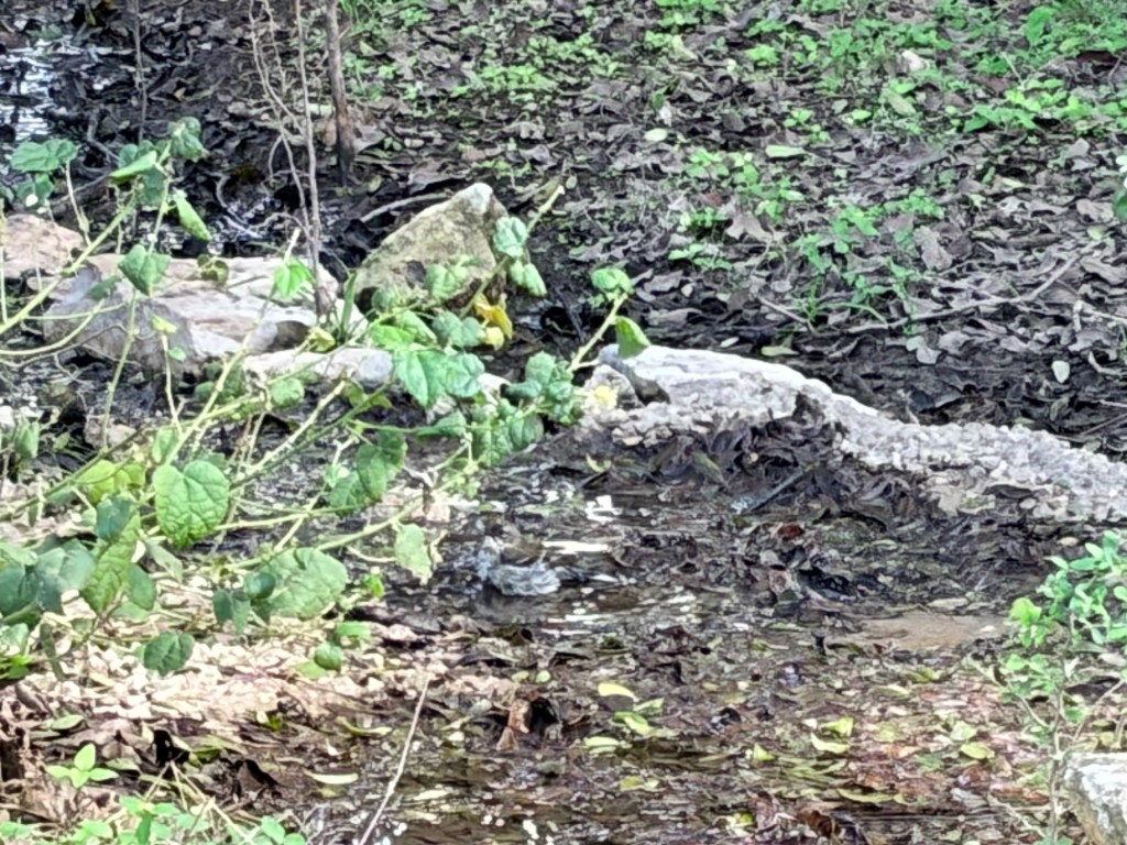 My reward was spending enough time at the blind to see fun bird behavior. For example, the birds decided it was bath time and I got to watch four Orange-crowned Warblers splashing and splashing in the puddle made by the drip waterer. They were then joined by Cardinals. The blurry photo shows where they were.