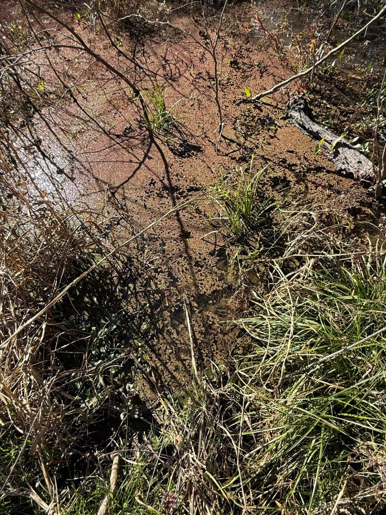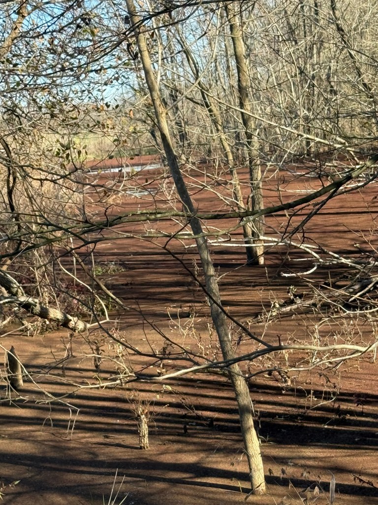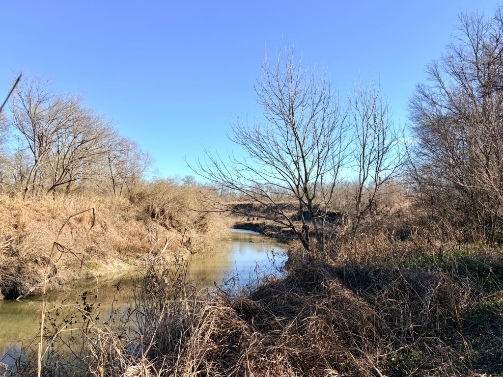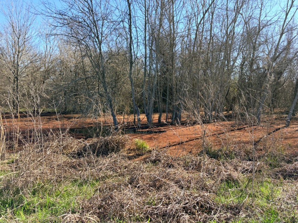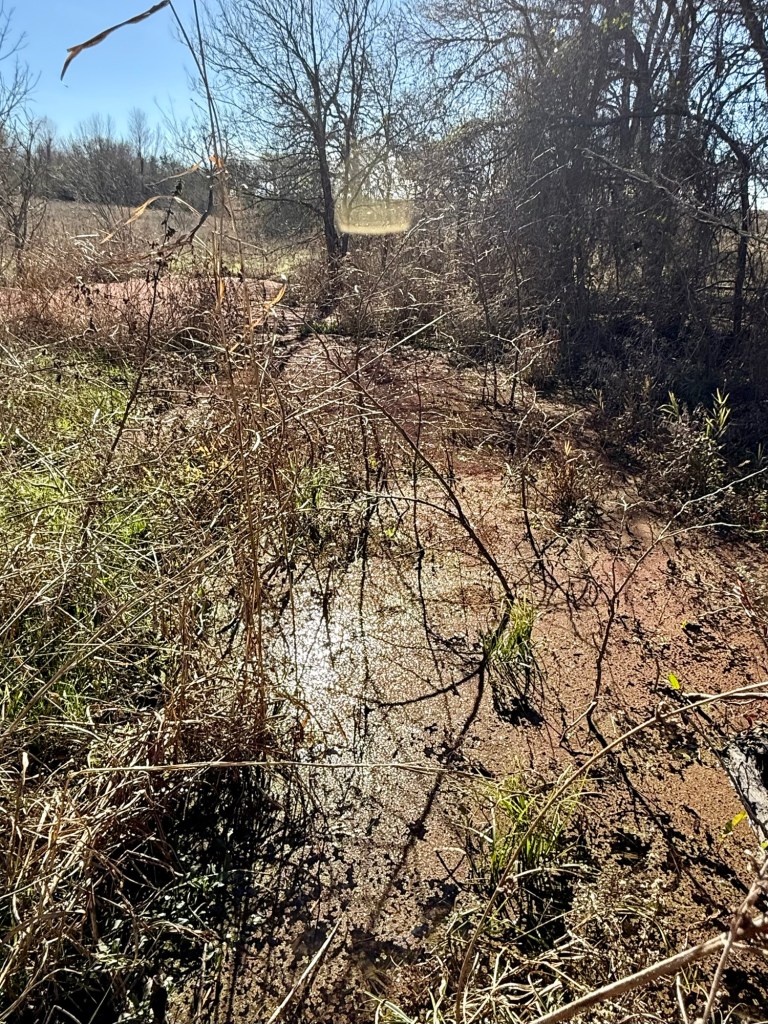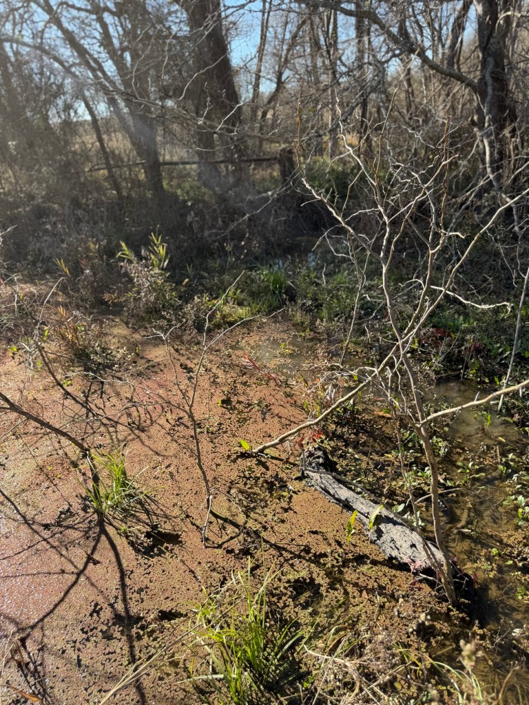 My friend called the folks who’d been on the property monitoring their deer lease or something, and they redirected us upstream. There we found what appeared to be weird flat areas with brown vegetation.