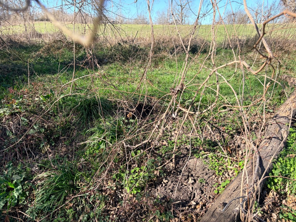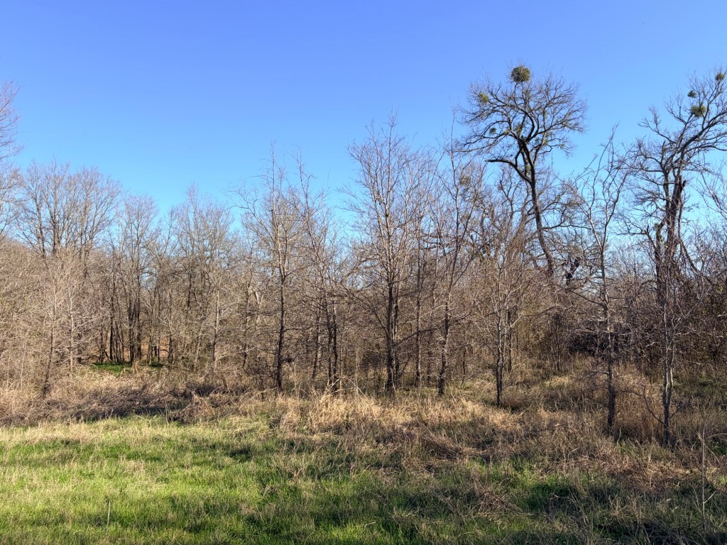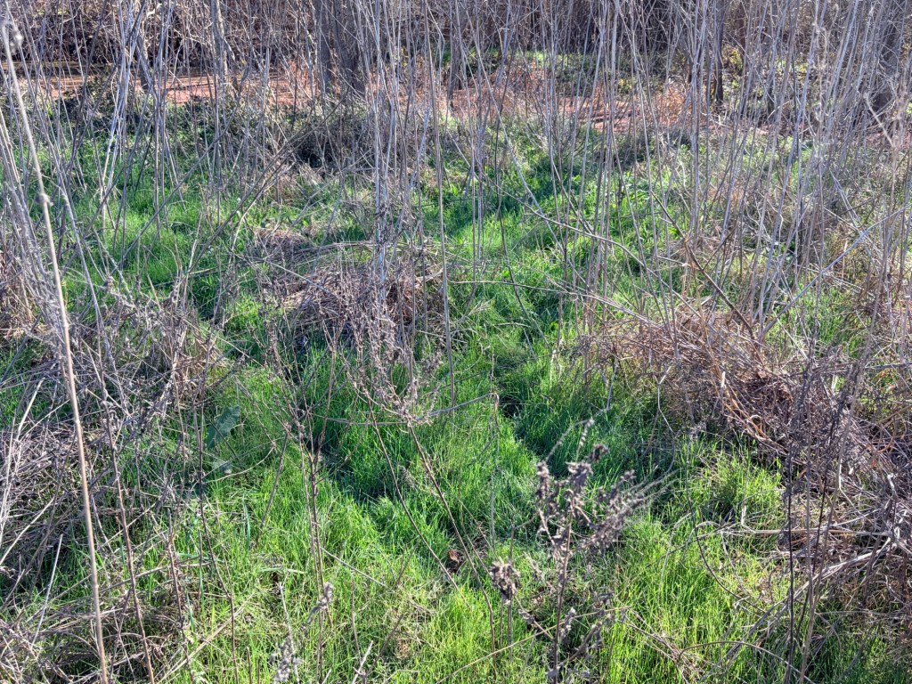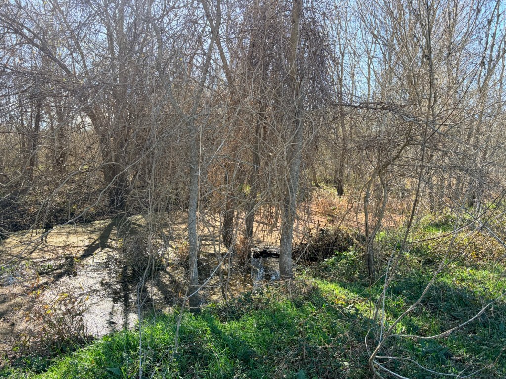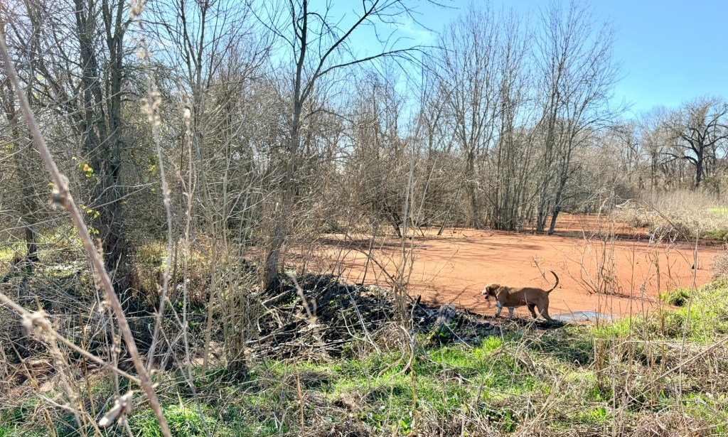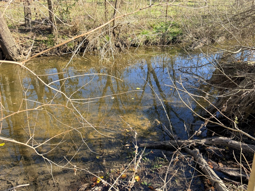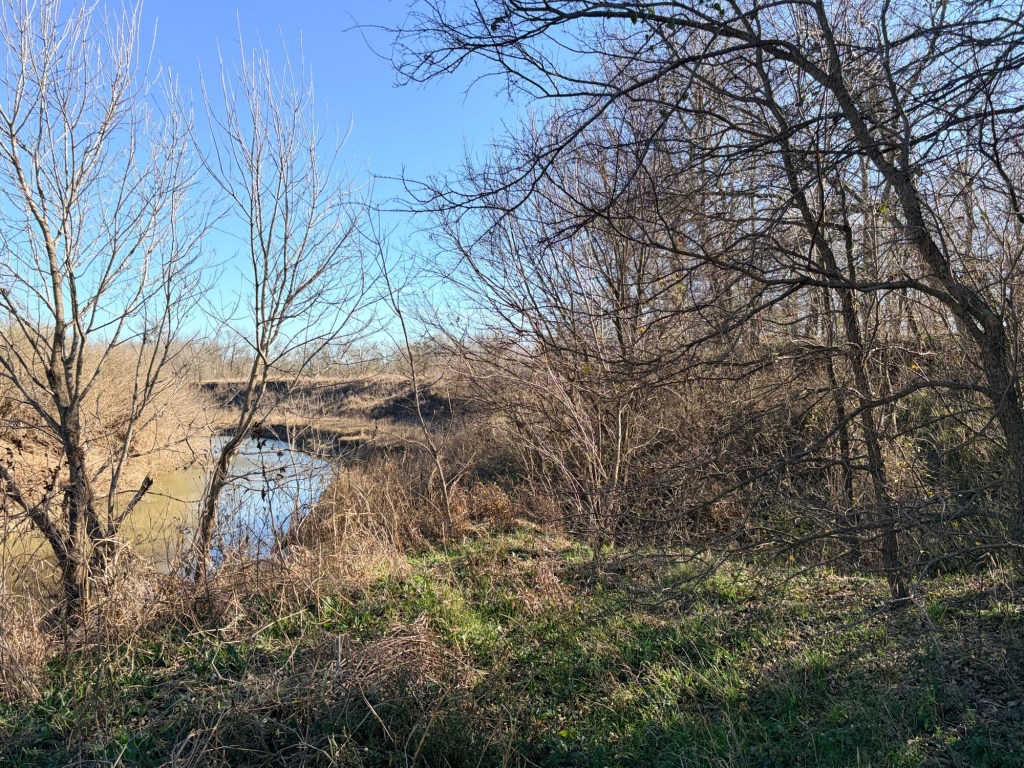 My friend called the folks who’d been on the property monitoring their deer lease or something, and they redirected us upstream. There we found what appeared to be weird flat areas with brown vegetation.