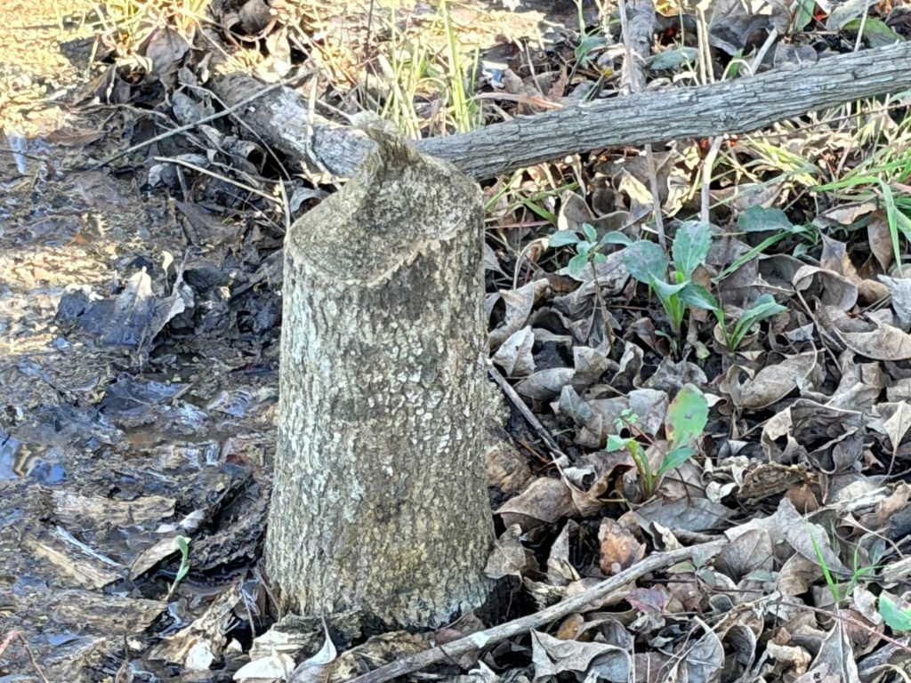 We found trees that had been gnawed by beavers (some from the previous dam a few years back). There were also trees whose bark had been gnawed.