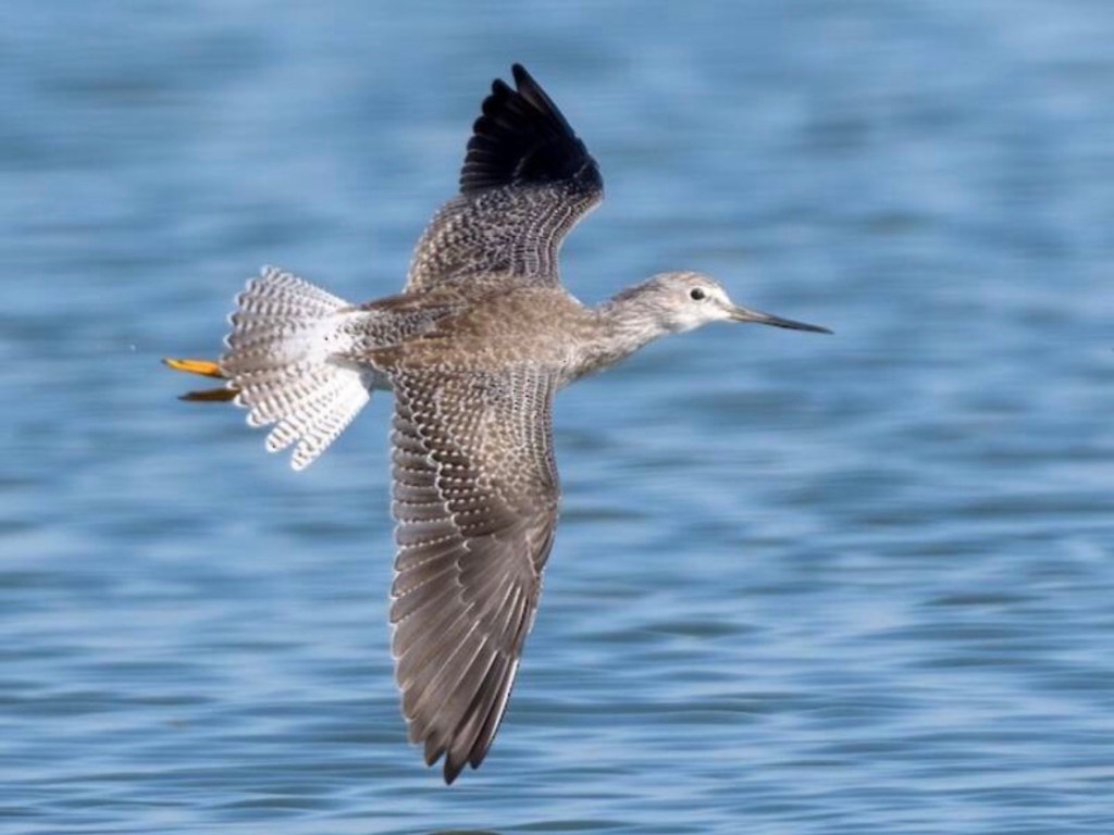 Fairly large shorebird with bright yellow legs. Plumage is essentially identical to Lesser Yellowlegs: gray upperparts with white speckling, streaky neck, and white belly. Proportions are most important for identification. Greater is larger overall with longer, thicker, more upturned bill, longer neck, blockier head, and bigger chest. Forages actively on mudflats and in shallow pools and marshes, often in loose mixed flocks with Lesser Yellowlegs. Somewhat more likely to be found in larger, more open habitats than Lesser, but much overlap. Listen for strong, ringing “tew tew tew!” calls, louder than Lesser, and usually three or four notes instead of one or two (though Greater can also give single notes). (from Merlin Bird ID)